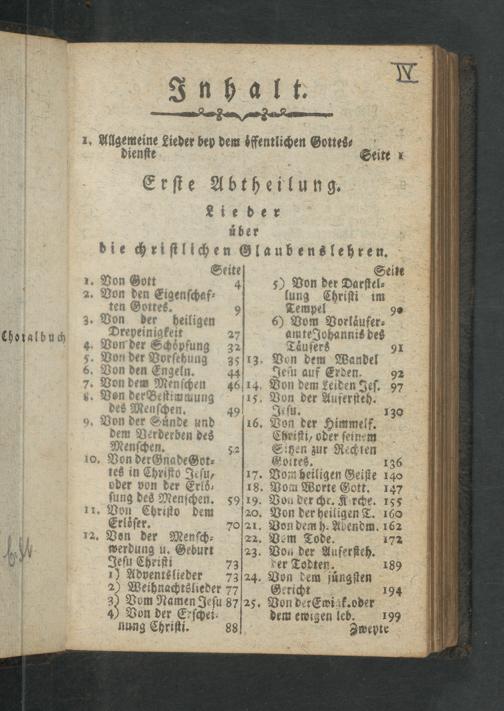 Lie der uͤber die chriſtlichen Glaubenslehren. . Seite Seite 1. Von Gott 5) Von der Darſtel⸗ 2. Bon den Eigenſchaf⸗ lung Chriſti im ten Gottes. 9 Tempel 9³ 3. Von der heiligen 6) Vom Vorlaͤufer⸗ Dreyeinigkeit 27 amte Johannis des 4. Von der Schoͤpfung 32 Taͤuſers 91 5. Von der Vorſehung 35 13. Von dem Wandel 6. Von den Engeln. 44 Jeſu auf Erden 92 7. Von dem Menſchen 46/14. Bon dem Leideng Jeſ. 97 8. Von der Beſtimmut 115. Von der Auferſfeh. des? 49 Jeſu. 130 9. Von d 16. Von der Himmelf. dem Chriſti, oder ſeinem Mer 52 Sitzen zur Rechten 10. Vot Foites. 136 tes in Jef 17. Vom heiligen Geiſte 140 vder von der Erlö⸗ 18. Pom Worte Eott. 147 ſung des M Nenſchen. 5919. Von der chr. Kirche. 185 11. Pon Chriſto dem 20. Von der heiligen T. 160 iſer. 70 21. Von dem h. Abendm. 162 12. Bon der Menſch⸗ 22. Vem Tode. 17² werdung u. Geburt 23. Von der Auferſteh. Jeſu Chriſti 73 der Todten. 189 1) Adventslieder 73 24. Von dem juͤngſten 2) We eihnachtslieder 77 Gericht 194 395 Vom Namen Jeſu 87 25. Von der Ewi k. oder 4) Von der Erſchei⸗ dem ewizen leb. 199 nung Chriſti. 88 Zweyte