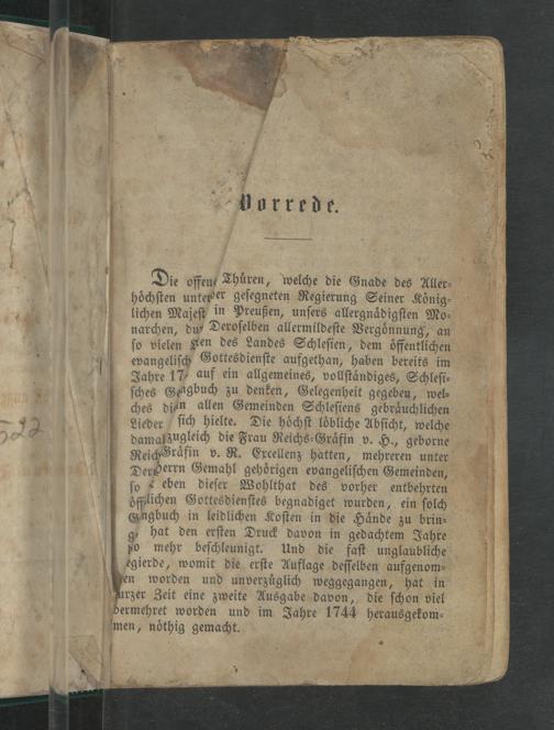Die offen Thuͤren, welche die Gnade des Aller⸗ hoͤchſten unteder geſegneten Regierung Seiner Koͤnig⸗ lichen Majeſt in Preußen, unſers allergnaͤdigſten Mo⸗ narchen, du' Deroſelben allermildeſte Vergoͤnnung, an ſo vielen Ken des Landes Schleſien, dem oͤffentlichen evangeliſch Gottesdienſte aufgethan, haben bereits im Jahre 177 auf ein allgemeines, vollſtaͤndiges, Schleſi⸗ ſches Gengbuch zu denken, Gelegenheit gegeben, wel⸗ hes dien allen Gemeinden Schleſiens gebraͤuchlichen gieder ſich hielte. Die hoͤchſt loͤbliche Abſicht, welche Le damalzugleich die Frau Reichs⸗Graͤfin v. H., geborne NeichSraͤfin v. R. Excellenz hatten, mehreren unter Derderrn Gemahl gehoͤrigen evangeliſchen Gemeinden, ſo eben dieſer Wohlthat des vorher entbehrten oͤffflichen Gottesdienſtes begnadiget wurden, ein ſolch Gugbuch in leidlichen Koſten in die Haͤnde zu brin⸗ „hat den erſten Druck davon in gedachtem Jahre do mehr beſchleunigt. Und die faſt unglaubliche egierde, womit die erſte Auflage deſſelben aufgenom⸗ ten worden und unverzuͤglich weggegangen, hat in urzer Zeit eine zweite Ausgabe davon, die ſchon viel bermehret worden und im Jahre 1744 herausgekom⸗ men, noͤthig gemacht. b