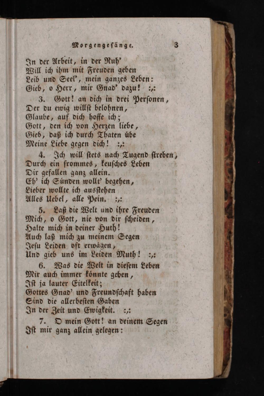 In der Arbeit, in der Ruh' Will ich ihm mit Freuden geben Leib und Seel', mein ganzes Leben: Gieb, o Herr, mir Gnad' dazu!:,: 3. Gott! an dich in drei Perſonen, Der du ewig willſt belohnen, Glaube, auf dich hoffe ich; Gott, den ich von Herzen liebe, Gieb, daß ich durch Thaten uͤbe Meine Liebe gegen dich!:,: 4. Ich will ſtets nach Tugend ſtreben, Durch ein frommes, keuſches Leben Dir gefallen ganz allein. Eh' ich Suͤnden wollt' begehen, Lieber wollte ich ausſtehen Alles Uebel, alle Pein.„,: