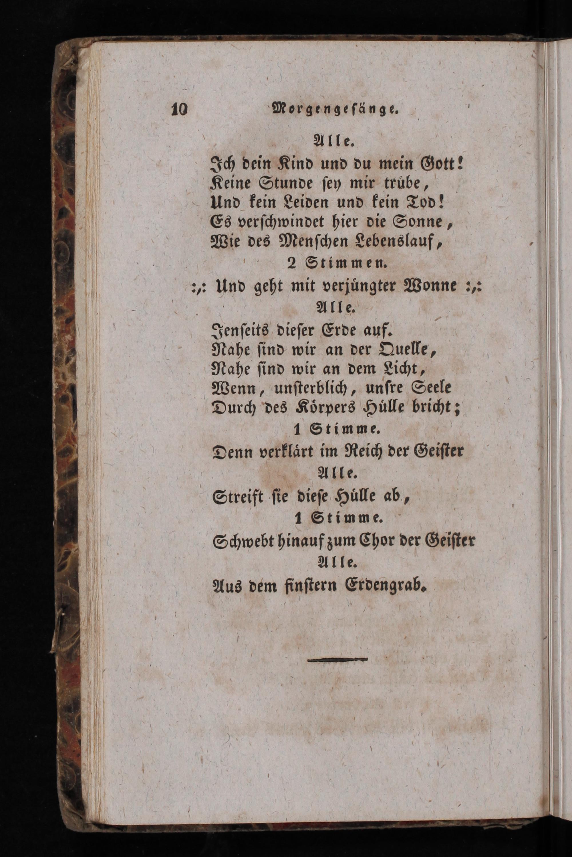 Alle. Ich dein Kind und du mein Gott! Keine Stunde ſey mir truͤbe, Und kein Leiden und kein Tod! Es verſchwindet hier die Sonne, Wie des Menſchen Lebenslauf, 2 Stimmen. : Und geht mit verjuͤngter Wonne:,: Alle. Jenſeits dieſer Erde auf. Rahe ſind wir an der Quelle, Rahe ſind wir an dem Licht, Wenn, unſterblich, unſre Seele Durch des Koͤrpers Huͤlle bricht; 1 Stimme. Denn verklaͤrt im Reich der Geiſter Alle. Streift ſie dieſe Huͤlle ab, 1 Stimme. Schwebt hinauf zum Chor der Geiſter Alle.