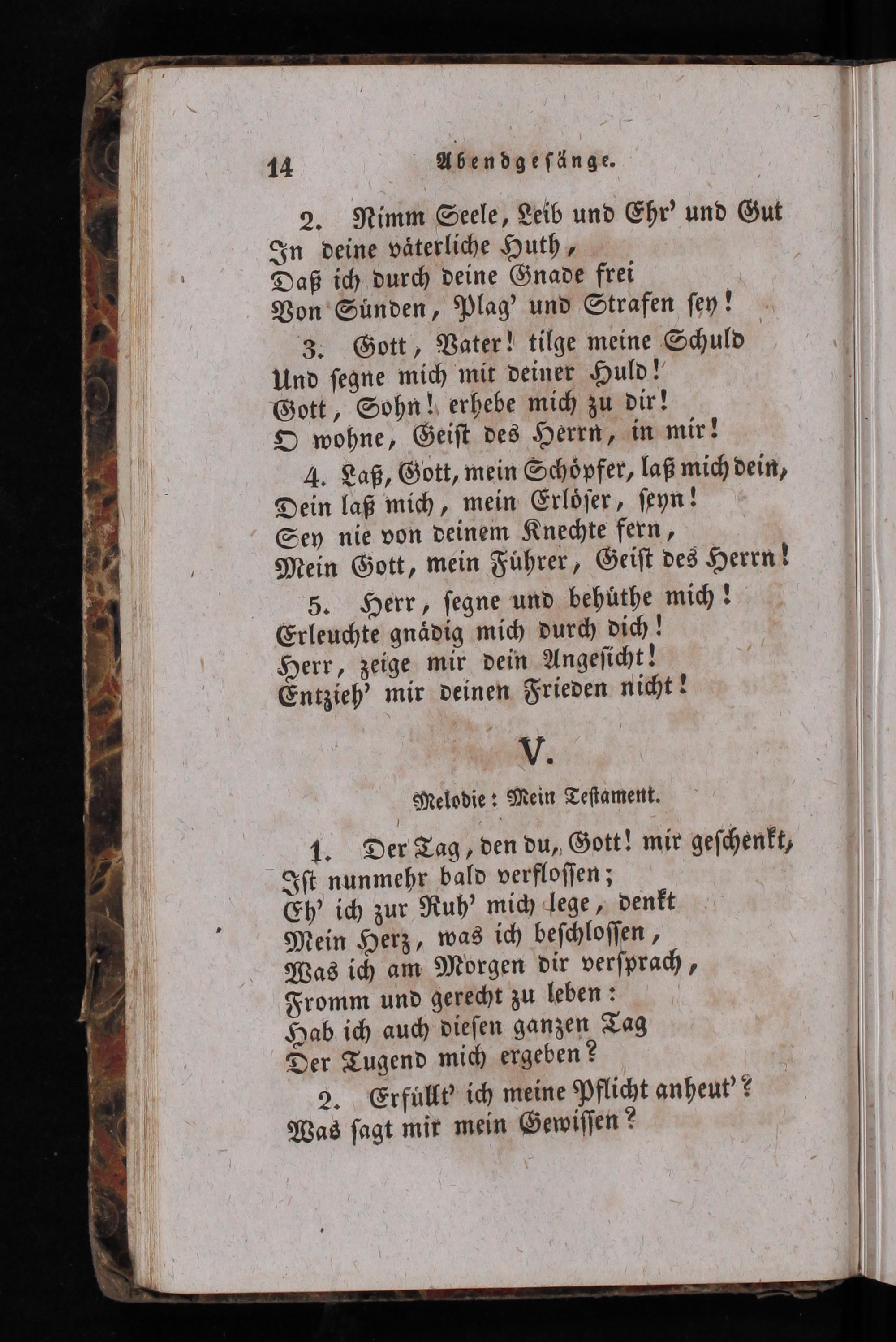 1. Der Tag, den du, Gott! mir geſchenkt, Iſt nunmehr bald verfloſſen; Eh' ich zur Ruh' mich lege, denkt Mein Herz, was ich beſchloſſen, Was ich am Morgen dir verſprach, Fromm und gerecht zu leben: Hab ich auch dieſen ganzen Tag Der Tugend mich ergeben?