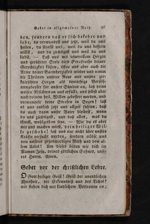 ben, ſondern daß er ſich bekehre und lebe, du verwundeſt uns jetzt, weil du uns heilen, du ſtrafſt uns, weil du uns beſſern willſt, und du zuͤchtigeſt uns weil du uns liebſt.— Laß uns mit reuevollem Herzen und geruͤhrter Seele dieſe Strafruthe deiner Gerechtigkeit kußen, oͤffne uns aber auch die Arme deiner Barmherzigkeit wieder und nimm die Thraͤnen unſerer Reue und unſere zer⸗ knirſchten Herzen als demuͤthige Verſoͤh⸗ nungsopfer fuͤr unſere Suͤnden an, laß deine weiſen Abſichten an uns erfuͤllt, uns ſelbſt aber nach deinem heil. Willen gebeſſert werden, und verwandele deine Strafen in Segen! laß es uns endlich jetzt und allzeit fuͤhlen, daß du auch dann unſer Vater bleibeſt, wenn du uns zuͤchtigeſt, und daß alles, was du thueſt, wohlgethan ſeye.— Wie du es aber mit uns machen wirſt, deinheiliger Wil⸗ le geſchehe! laß uns nur nicht uber unſere Kraͤfte verſucht werden, ſondern erlöſe uns von unſerer gegenwärtigen Roth und von al⸗ lem Uebel! Um dieſes bitten wir dich im Namen Jeſu, deines gottlichen Sohnes, unſe⸗ res Herrn. Amen.