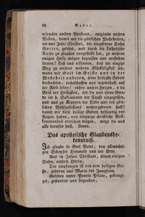 erleuchte unſern Verſtand, entzuͤnde unſern Willen, damit wir die göttlichen Wahrheiten, die uns Jeſus Chriſtus, der eingeborne Sohn Gottes, gelehrt, und durch die katholiſche Kirche zu glauben vorgeſtellt hat, zu unſerm ewigen Heile moͤgen begreifen und verſtehen lernen! Laß uns erkennen, daß der einzige Weg zu unſerer wahren Gluͤckſeligkeit ſey, wann wir Gott im Geiſte und in der Wahrheit anbeten, ſeine heiligſte Gebote beobachten, rechtſchaffen und tugendhaft auf der Welt leben! ruͤhre unſere Herzen, o du Geiſt der Heiligkeit, der du uns deine Gna⸗ de im h. Sakramente der Taufe eingegoſſen, und uns zu Kindern der Liebe und des goͤtt⸗ lichen Wohlgefallens wiedergeboren haſt! damit wir dieſe heilige Gebote beſtändig vor Augen haben, und diejenige chriſtliche Voll⸗ kommenheit erreichen moͤgen, wozu du uns alle berufen haſt. Amen.