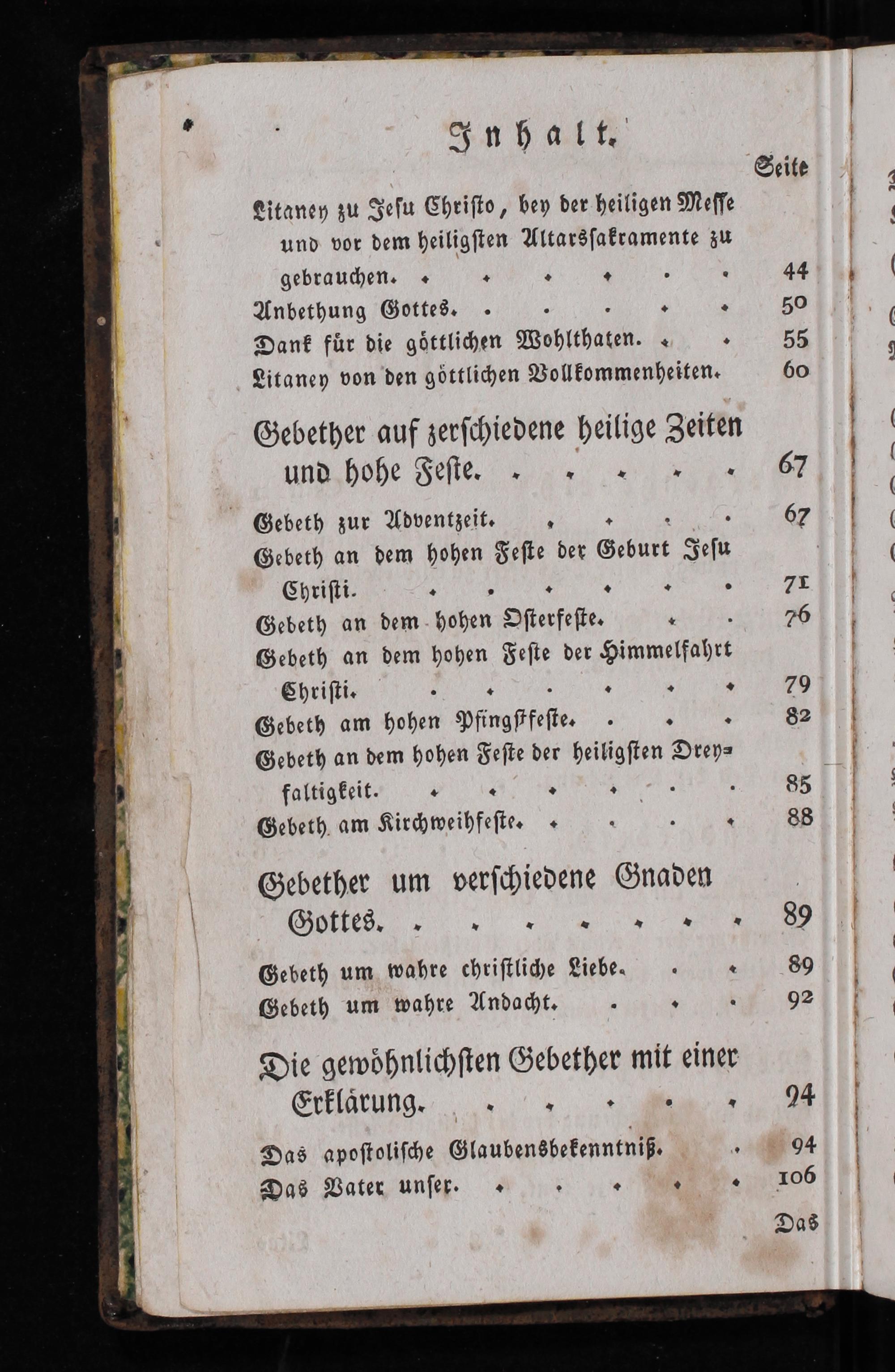 Die gewohnlichſten Gebether mit einer Etilichug. Das apoſtoliſche Glaubensbekenntniß⸗ 94 Das Vater unſer.„ 5. 106 Das