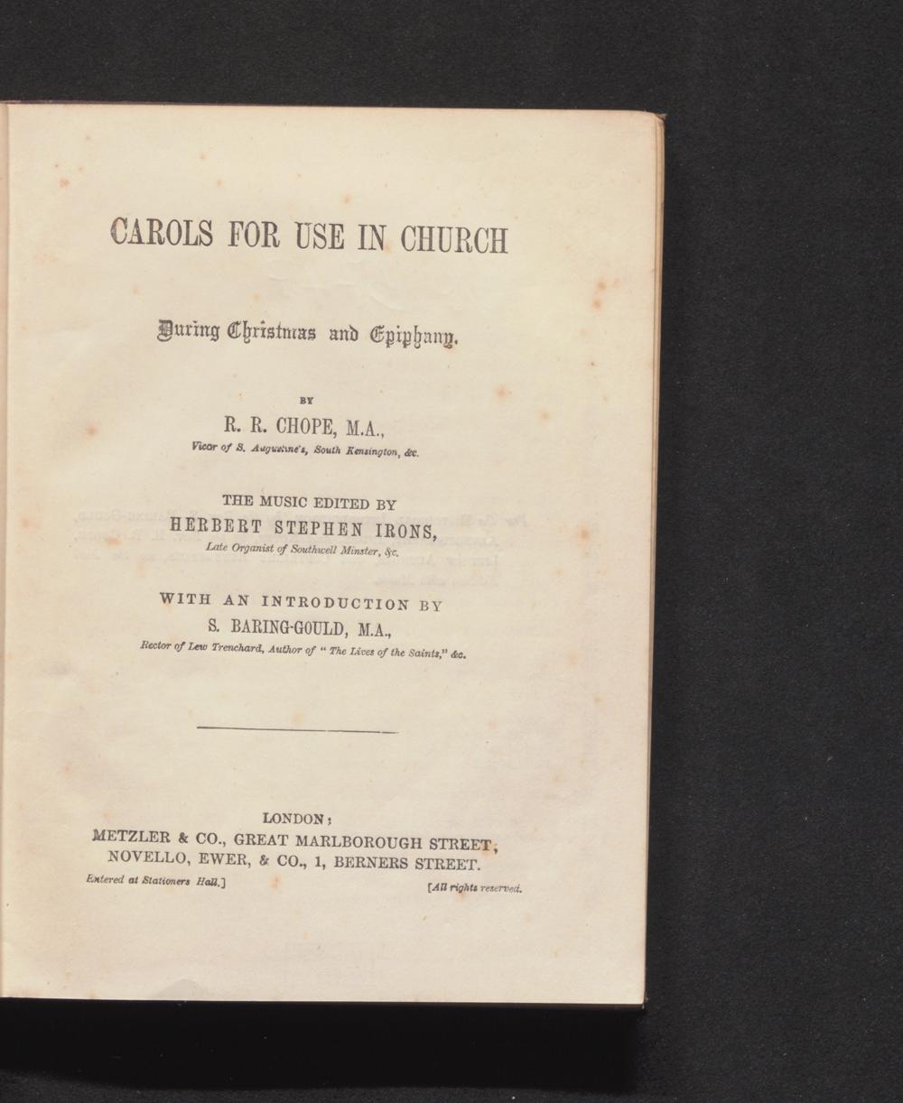 Carols for Use in Church During Christmas and Epiphany / by R. R. Chope, the Music edited by Herbert Stephen Irons, with an Introduction by S. Baring-Gould