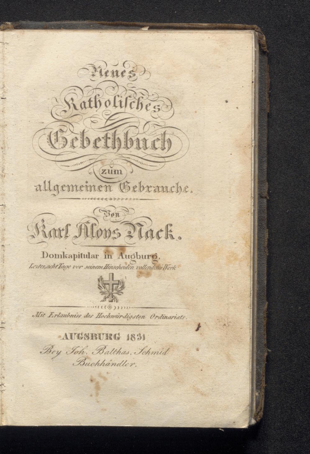 Neues Katholisches Gebetbuch zum allgemeinen Gebrauche / von Karl Aloys Nack, Domkapitular in Augsburg. Letztes, acht Tage vor seinem Hinscheiden vollendetes Werk. Mit Erlaubniss des Hochw. Ordinariats