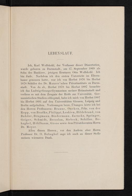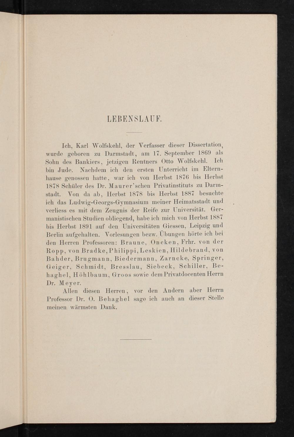 Ich, Karl Wolfskehl, der Verfasser dieser Dissertation, wurde geboren zu Parmstadt, am 17. September 1869 als Sohn des Bankiers, jetzigen Rentners Otto Wolfskehl. Ich bin Jude. Nachdem ich den ersten Unterricht im Eltern- hause genossen hatte, war ich von Herbst 1876 bis Herbst 1878 Schüler des Dr. Maurer'schen Privatinstituts zu Darm- stadt. Von da ab, Herbst 1878 bis Herbst 1887 besuchte ich das Ludwig-Georgs-Gymnasium meiner Heimatsstadt und verliess es mit dem Zeugnis der Reife zur Universität. Ger- manistischen Studien obliegend, habe ich mich von Ilerbst 1887 bis Herbst 1891 auf den Universitäten Giessen, Leipzig und Berlin aufgehalten. Vorlesungen bezw. Ubungen hörte ich bei den Herren Professoren: Braune, Oncken, Frhr. von der kopp, von Bradke, Philippi, Leskien, Hildebrand, von Bahder, Brugmann, Biedermann, Zarncke, Springer, Geiger, Schmidt, Bresslau, Siebeck, Schiller, Be- haghel, Höhlbaum, Groos sowie dem Privatdocenten Herrn Dr. Meyer.