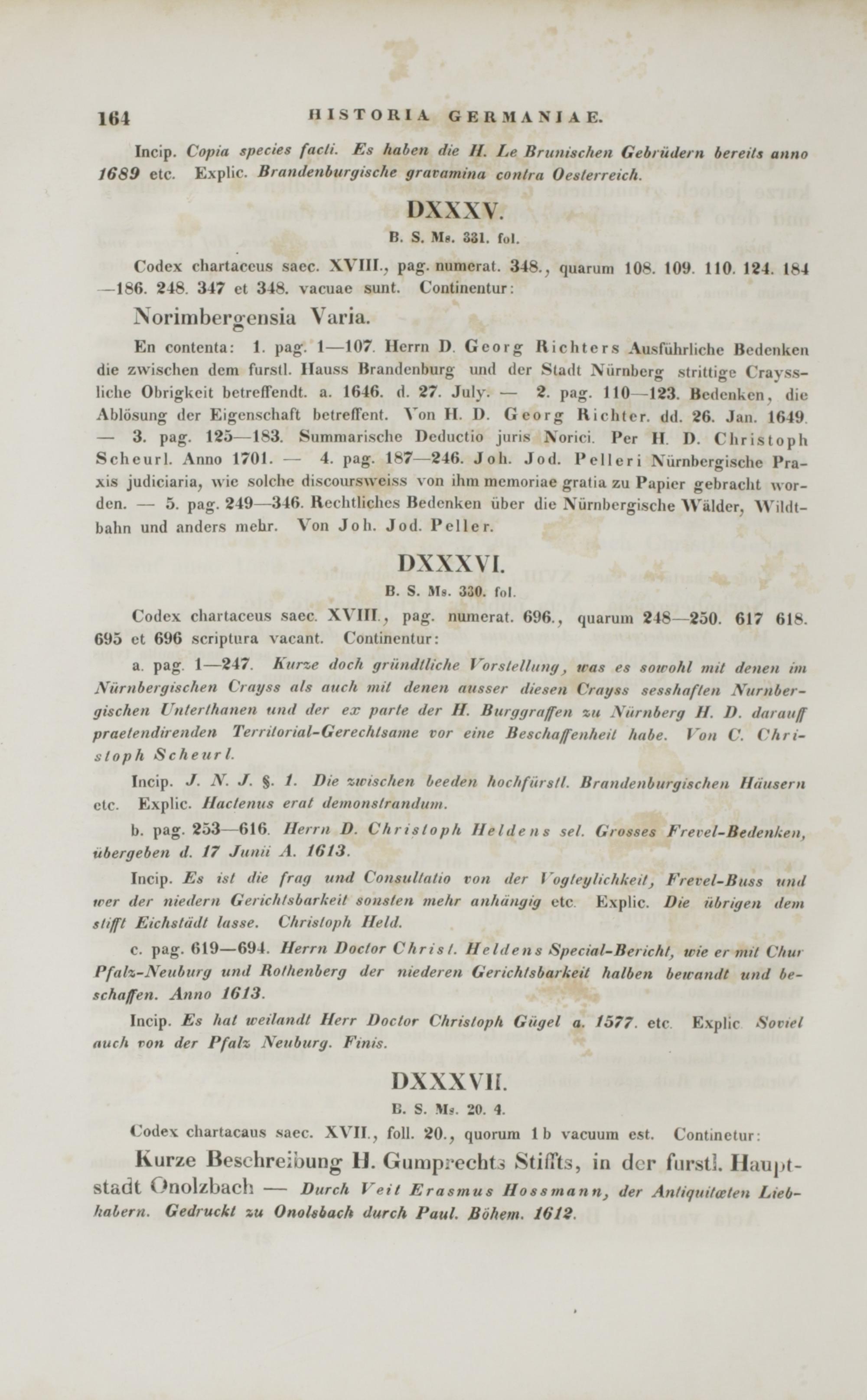 En contenta: 1. pag. 1—107 Herrn D Gcorg Hichtcrs Ausfuhrliche Hcdcnkcn die zwischen dcm furstl. Ilauss Brandcnburg und der Siadt Nurnbcrg strittige Crayss- liche Obrigkcit bctrcflendt. a. 1646. d. 27. July. — 2. pag. 110 -123. Bcdenken. die Abliisung dcr Eigenschaft betreflcnt. Von II. D. Georg Hichter. dd. 26. Jan. 1649 — 3. pag. 125—183. Summarische Dcductio juris Norici. Pcr II. D. Christoph Schcurl. Anno 1701. — 4. pag. 187—246. Joh. Jod. Pelleri Nurnbcrgischc I*ra- xis judiciaria, wic solche discoursweiss von ihm mcmoriae gratia zu Papier gebracht wor- dcn. — 5. pag. 249—346. Rcchtlichcs Bcdenken ubcr die Niirnbcrgische Waldcr. Wildt- bahn und andcrs mehr. Von Joli. Jod. Pcller.