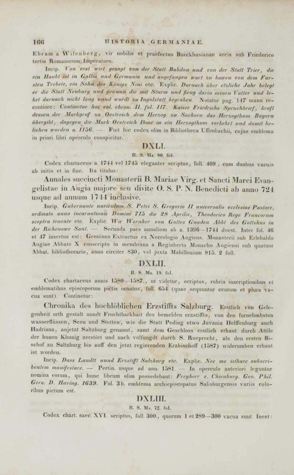 Incip. Von erst irirt gesagt ron iler Statt Rabiton und ron tler Slall Trier, die em lltiiibl isl in Gallia iiiitl Germania und ungefangen irart zn liairen ron ierm Fur- sten Trebele, ein Saltii des Kiinigs Nini ctc. Explic. Darnuch iibcr etxliehe Jalir belegt er tlie Statl Xeubitrg iiml geirann tlie init Sfurm und fieng darin seinen Valler uml le- bel tlarnaclt nichl lang iinntl wurdt %M Ingolslatt begraben Notatur pag. 147 nianu rc- centiorc: Contutetur hoc rol. chrou. II. fol. 117. haiser Frietlriclis Sptnehhrief, krafl tlessen tler Murkgraf zn Oestreiclt tlem IIer%og zti Siiclisen tlas Heizoijlliiini Hayeiii itbergtbt, tlagegeti the Mark Oeslteich Iltnie in ein llennglhum retkeliil itinl tlitmit l>e- liehen irortlen a. 1156. - Fuit bic couVx oliin in Bililiotbeca L flenbachii, cujus cniblcma in priori libri opcrculo conspicitur.