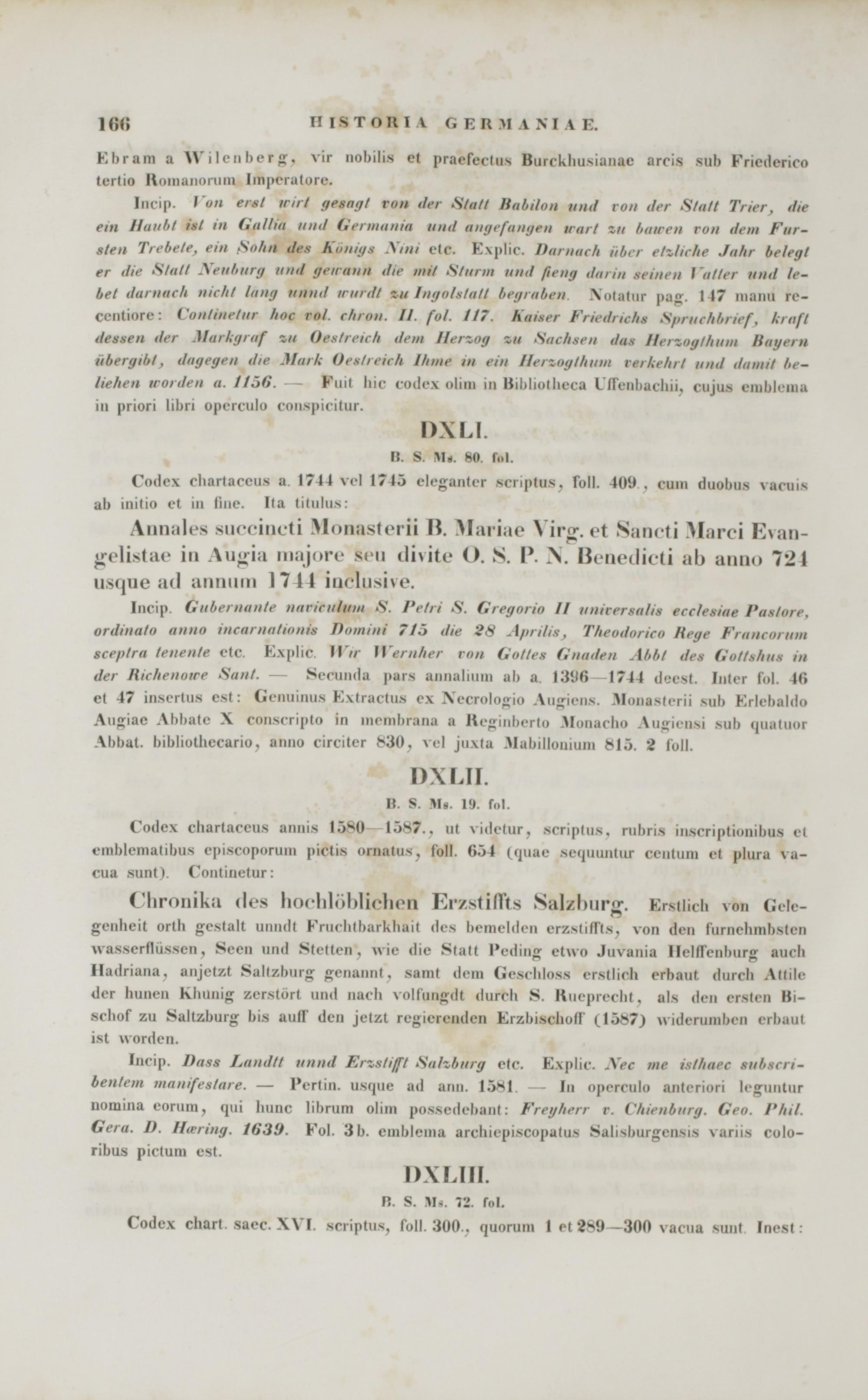 Incip. Dass Landtt unnd Ensti/ft Sahbnrg etc. Explic. Xec me istltaec subscrt- bentem manifestare. — Pcrtin. usque ad ann. 1581. — In opcrculo antcriori lcguntur DOmina eornm, qui hunc lihrum olini posscdehant: Freijlterr r. C/tieitbiirg. Geo. Phil. Gera. D. Hwring. 1639. Eol. 3b. emblema archiepiscopatus Salisburgensis variis colo- ribus piclum est.