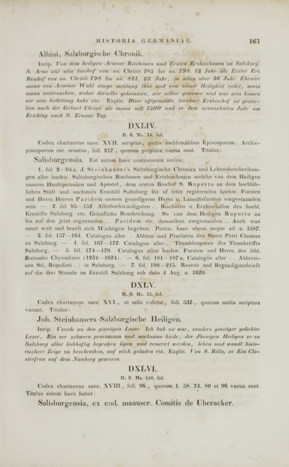 3. fol. 157 -164. Catalogus aller . . Abhtcn und Praclatcn dcs Sanct Petri Clostcrs zu Salzburg. — 4 fol. 167—172. Catalogus allcr. . Thnmbbropsterj dcs ThumbatiiTta Salzburg. — 5. fol. 174—179. Catalogua allcr hochw. Furaten und Hcrrn des lobl. Biaturaba Chycmbsec (1234—16241. — 6. fol. 181 187 a. Catalogus aller . . Ahbtcsi- ncn Sli. Bcucdicti . . in Sal/.bnrg. — 7. fol. 190—215. Iteccss und Bcgnadigunsbriefe auf die drci Sueiule im Krzslift Salzburg suh dato 4 Aug. a. 1620.