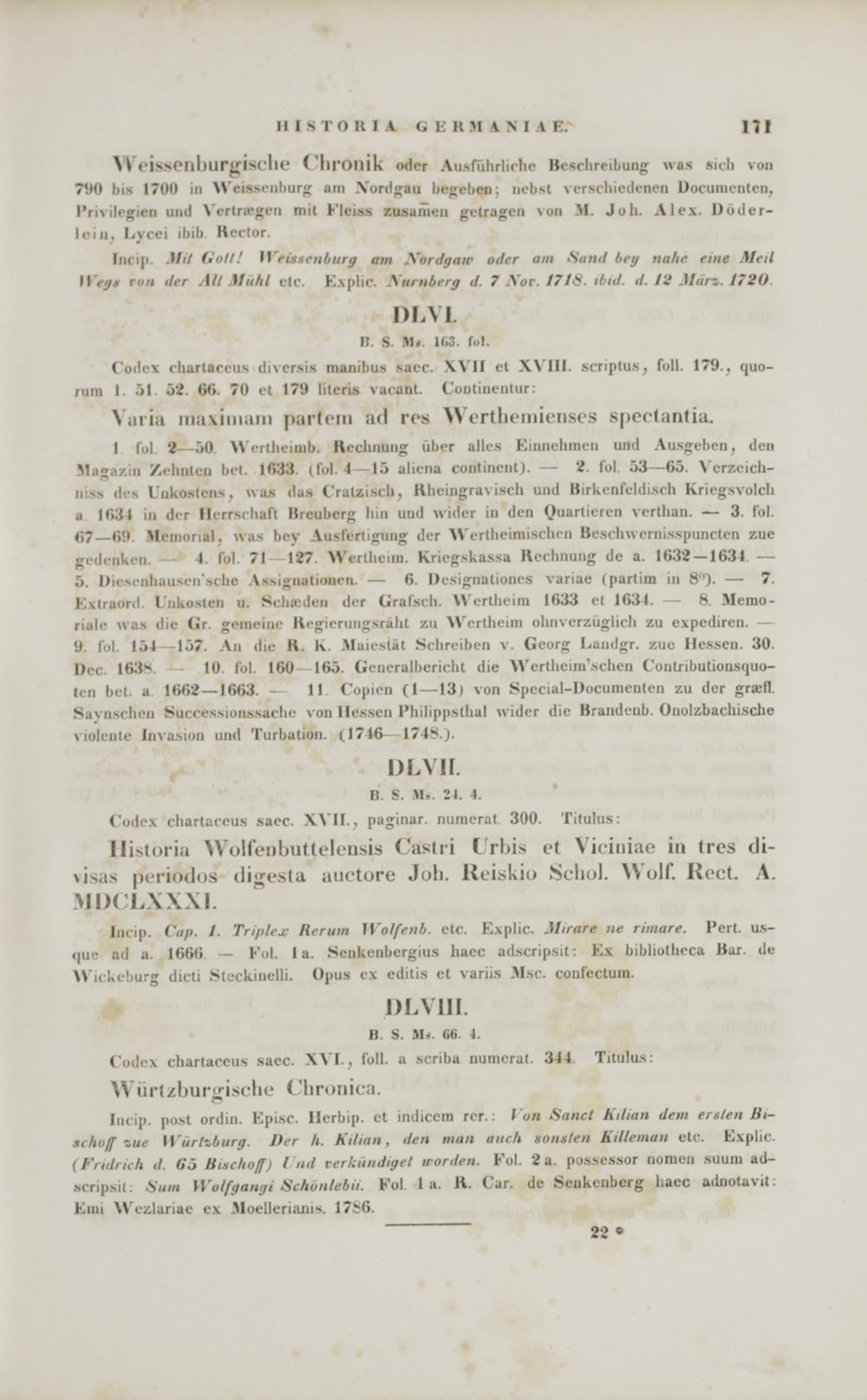 YVcissOllllurffisclie C "lironik odcr Ausnihrlirhe Besclireibung was sich von 7 (10 his 1700 iii Wcissriiliurg uin .Vonlgau bcgeben: nebst \ erW •hicilcnen Docuinenlen, 1'rivilegien und Verlriegcn mil Kleiss zusamen gclragen von M. Job. Alex. Dbder- leiu, Lyrei ibib Kector.