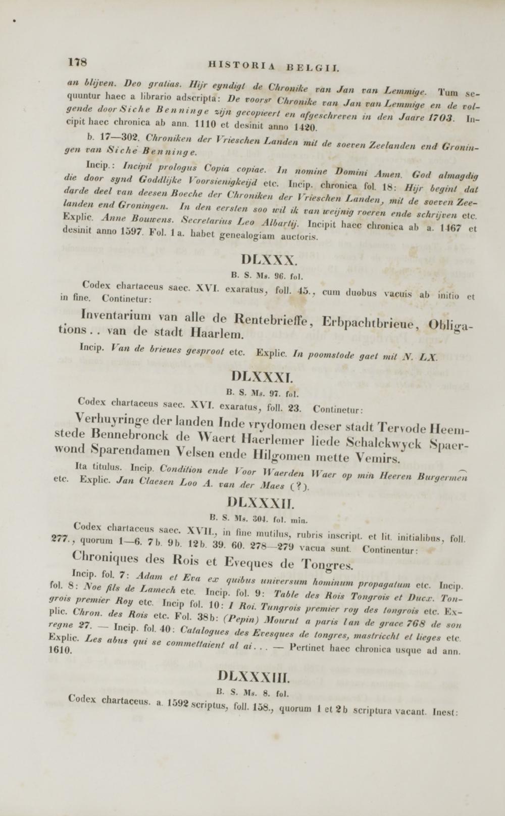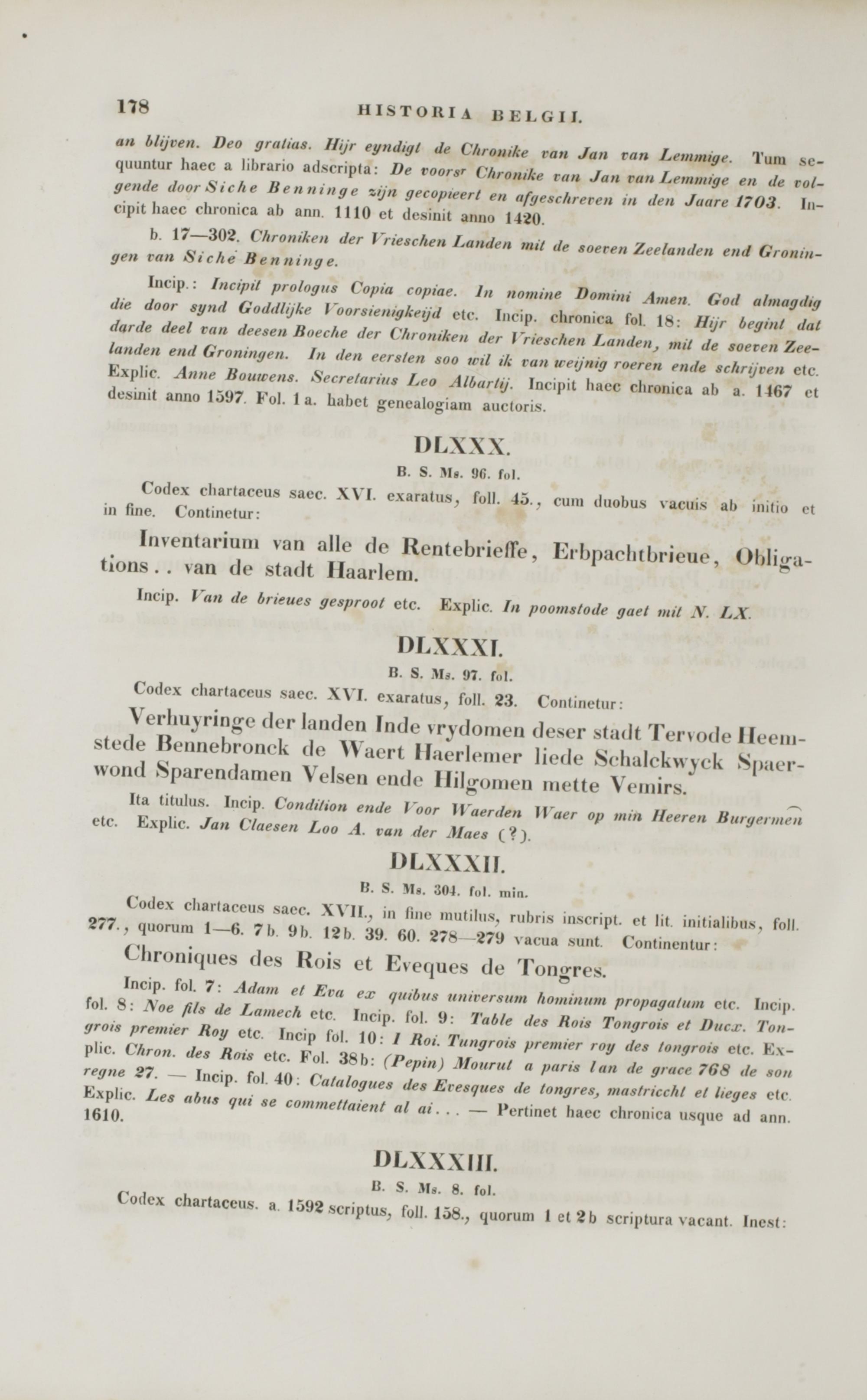Incip : Incipit prologus Copia copiae. ln nomine Domim Amen God almagdig die door synd Goddlijke Voorsientgkeijd etc. Incip. clironica fol 18: Hijr begint dat darde deel ran deesen Bneche der ('hroniken der \~rieschen Landen, mit de soeren Zee- landeii end Groniiigen. In den eersten soo wfl ik van ireijnig roeren ende schrijven ctc. Explic. Anne Bouwens. Secretarius Leo Albartij. Incipit haec chronica al> a. 1167 el desuiit anno 1597. Eol. 1 a. habct gcnealogiam auctoris.