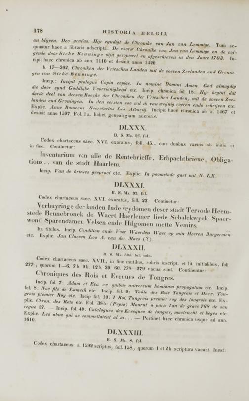 Incip. fol. 7: Adatn et Era e.r guibtu universum hominum propmgatum etc. Incip. fol. 8: Aoe fi/s de Lamech ctc. Incip. fol. 9: Table des Hois Tongrois et Ducx. Ton- grois premier Roy etc Incip fol. 10: / Roi. Tungrois premier roy des longrois ctc. Ex- plic. Chron. des Rois ctc. Fol. 38b: (Pepin) Mourut a paris lan de grace 768 de son regne 27. — Incip. fol. 40: Catalogues des Eresques tle tongres, mastricchl et lieges ctc Explic. I ,e8 abus qtti se commettaient al ai. . . — 1'ertinet haec chronica usqiie ad ann. 1610.