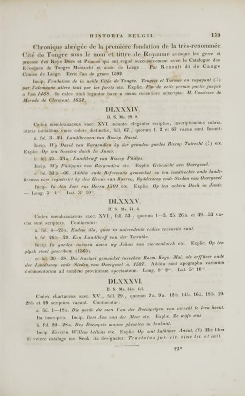 Incip. Fondalion de la noble Ctlee de Tongre. Tongris el Titrntts en royayanl ( ! ) par iiileniagne allere lanl par les forels clc. Kxplic. Kin de celle premie partie jusqne a t an I46H. ln calcc tituli lcguntur liucc a nianu reccnliorc adsciipla : .1/. Comlesse de Merode de Clermoit/. 11152.
