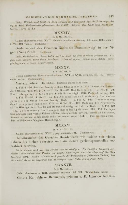 I. Fol. 2—30. Braunsch wcigischcs Stadtreclit a. 1532. Impress. ap. 1'ufen- dorf Observ. Tom. IV. p. 78. — 2. Fol. 3S—12. Dat Kchtcding. — 3. Fol. 44—72. Dat Cndcrgcrichte dcr crbarn Stadt Brunswigk. 1532. Pufend. ib. pag 120. —■ 4. Fol. 73—83. Articull tbo dcr Kcformation und crclerung des under- gcrichts dcr Stalt Braunsch wcig. 1353. — 5. Fol. S7—92a. Verbcsscrung dcs Lntergerichtsprocess. 1579.— 6. Fol. 92b 121. Orilnungdes 1'rocesscs, so im Obcrgcricht der Stadt Braunschwcig zu haltea 1553. — 7. Fol. 122 —157. Vcrbcsscruiig dcr Obcrgerichlsordnung de anno 1374. Fol. 1 b. hnjus libtj adscripta sunt verba: Lhiquc additac notac, decreta noviora, sentewiae illuslrantes, lonniilaria. maximc in line mullis foliis. ad annuin usquc 1643. — Fuit hic codex i|uou- ilam iu hihllothrca Miegiana lleidelbergae.