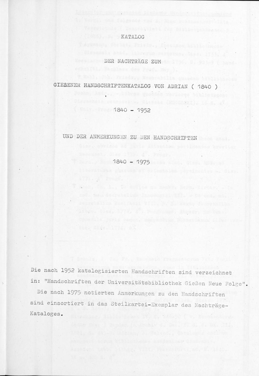 GIEßENER HANDSCHRIFTENKATALOG VON ADRIAN ( 1840 )