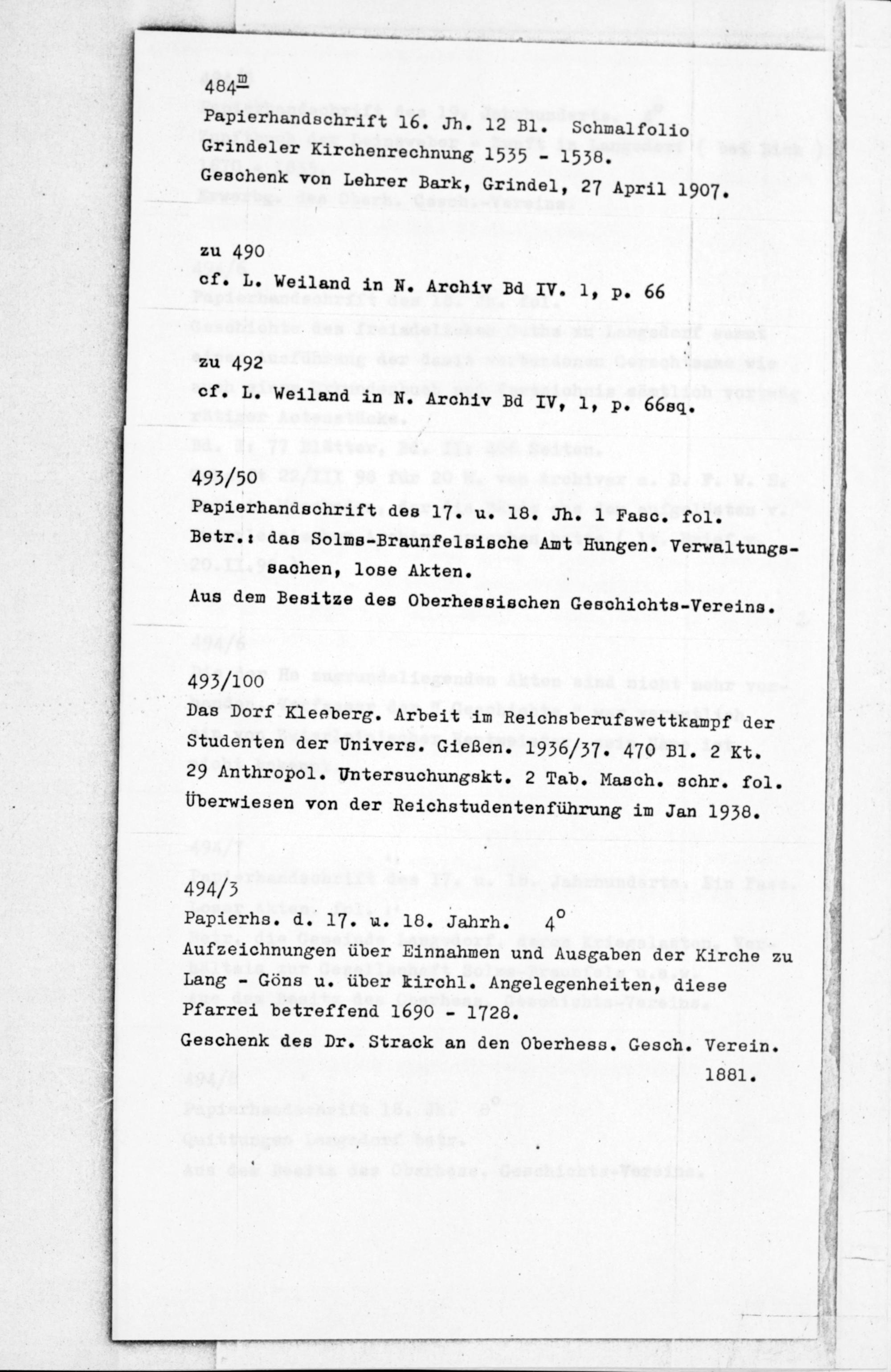Das Dorf Kleeberg. Arbeit im Reichsberufswettkampf der Studenten der Univers. Gießen. 1936/37. 470 Bl. 2 Kt. 29 Anthropol. üntersuchungskt . 2 Tab. Masch, sehr. fol. Überwiesen von der Reichstudentenführung im Jan 1938.