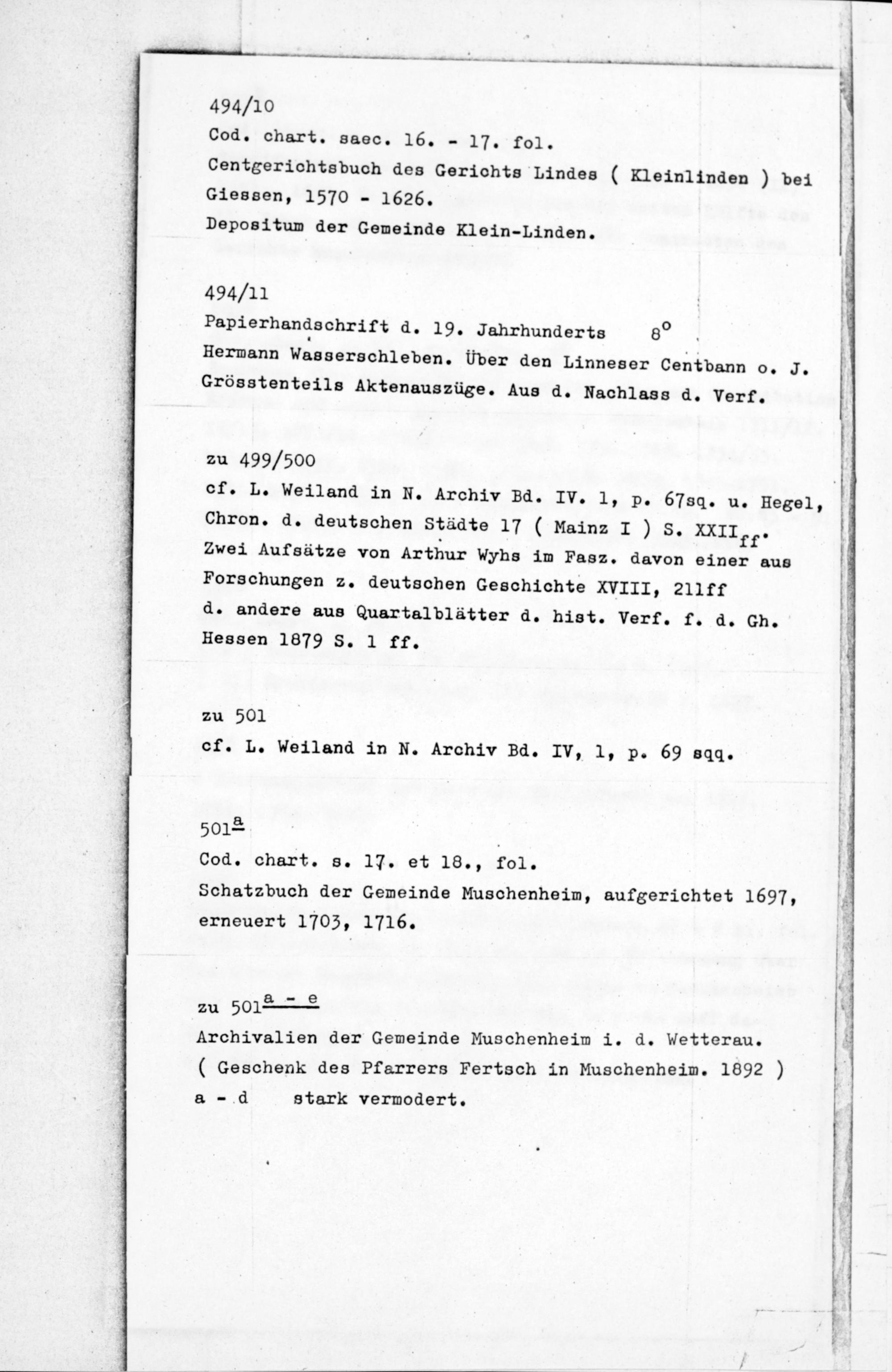 Archivalien der Gemeinde Mu3chenheim i. d. Wetterau. ( Geschenk des Pfarrers Fertsch in Muschenheim. 1892 ) a - d stark vermodert.