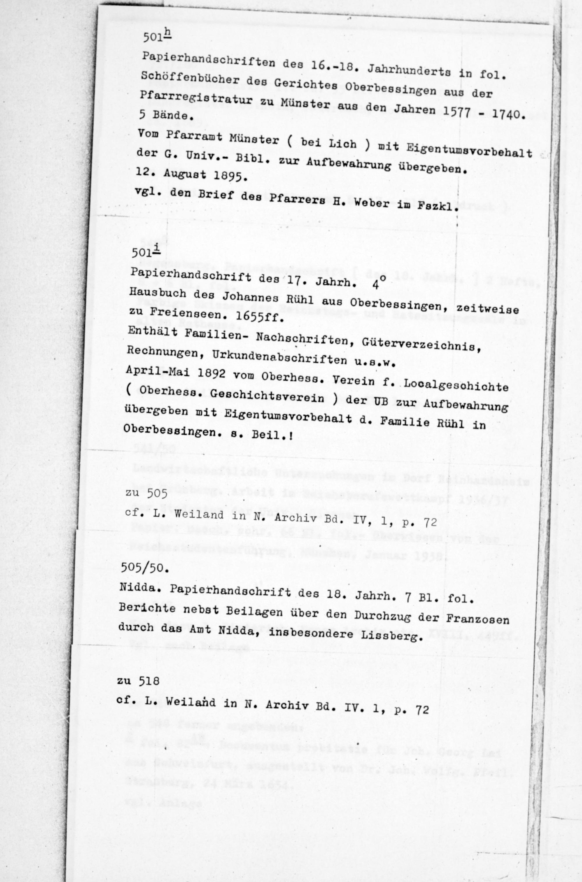Enthält Familien- Nachschriften, Güterverzeichnis, Rechnungen, Urkundenabschriften u.s.w, April-Mai 1892 vom Oberhees. Verein f. Looalgesohiohte ( Oberhess. Geschichtsverein ) der UB zur Aufbewahrung übergeben mit Eigentumsvorbehalt d. Familie Rühl in Oberbessingen, s. Beil.!