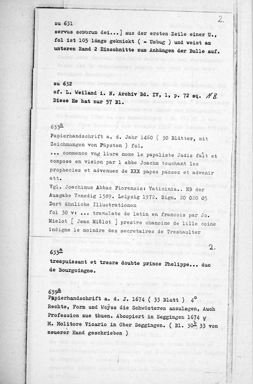 Papierhandschrift a. d. J. 1674 ( 33 Blatt ) 4 Rechte, Fora und Veyss die Schwösteren anzulegen, Auch Profession zue thuen. Abcopiert in Seggingen 1674 γ M. Molitore Vicario in Ober Seggingen. ( Bl. 30^- 33 von