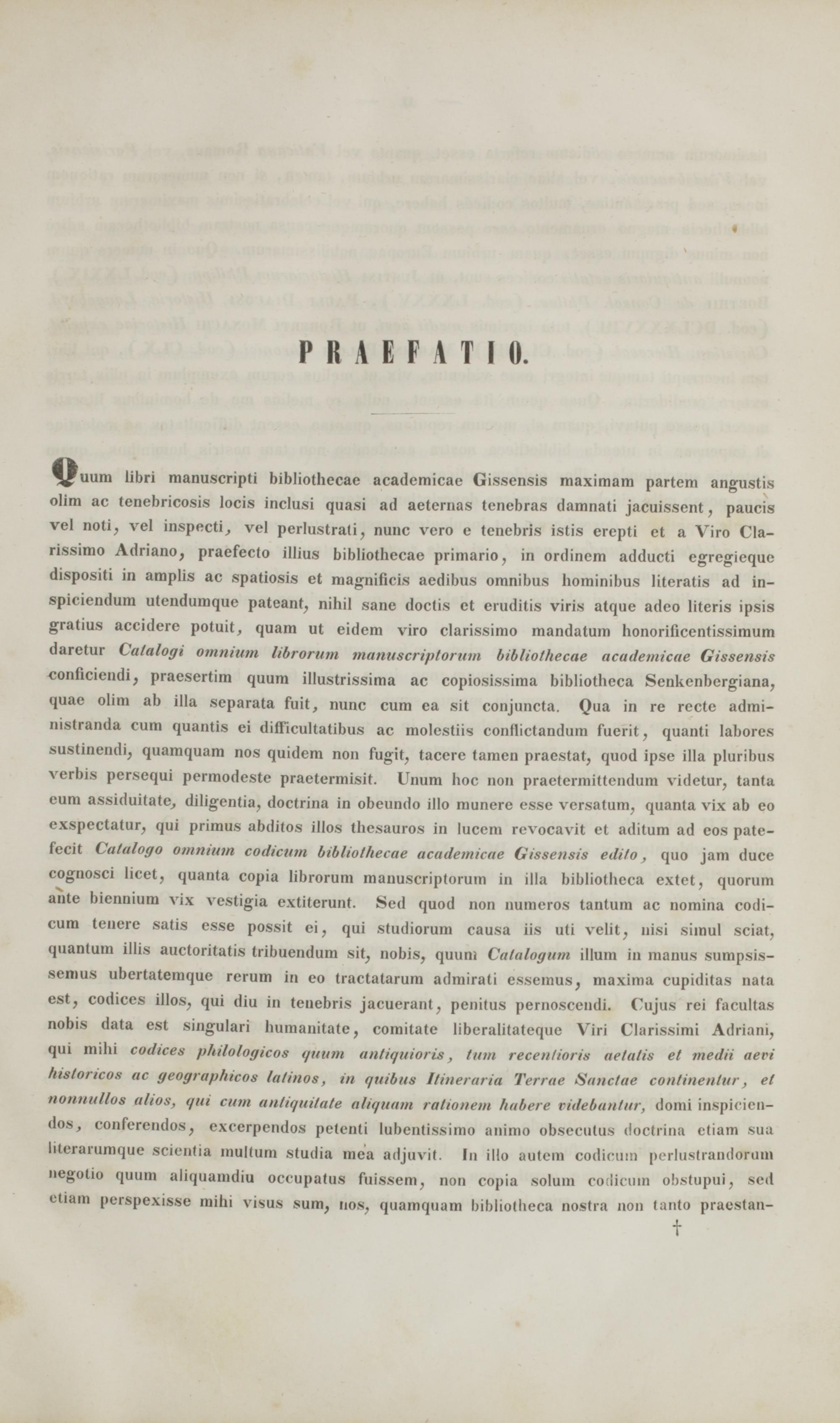 f ^uum libri manuscripti bibliothecae academicae Gissensis maximam partem angustis olim ac tenebricosis locis inclusi quasi ad aeternas tenebras damnati jacuissent, paucis vel noti, vel inspecti, vel perlustrati, nunc vcro e tenebris istis erepti et a Viro Cla- rissimo Adriano, praefecto illius bibliothecae primario, in ordinem adducti egregieque dispositi in amplis ac spatiosis et magnificis aedibus omnibus hominibus literatis ad in- spiciendum utendumque pateant, nihil sane doctis et eruditis viris atque adeo literis ipsis gratius accidere potuit, quam ut eidem viro clarissimo mandatum honorificentissimum daretur Calalogi omnium libroritm munuscriptornm bibliothecae academicae Gissensis conficiendi, praesertim quum illustrissima ac copiosissima bibliotheca Senkenbergiana, quae olim ab illa separata fuit, nunc cum ea sit conjuncta. Qua in re recte admi- nistranda cum quantis ei difficultatibus ac molestiis conflictandum fuerit, quanti labores sustinendi, quamquam nos quidem non fugit, tacere tamen praestat, quod ipse illa pluribus verbis persequi permodeste praetermisit. Unum hoc non praetermittendum videtur, tuntu eum assiduitate, diligentia, doctrina in obeundo illo munere esse versatum, quanta vix ab eo exspectatur, qui primus abditos illos thesauros in lucem revocavit et aditum ad eos pate- fecit Catalogo omnium codicum bibliothecae academicae Gissensis edito, quo jam duce cognosci licet, quanta copia librorum mauuscriptorutn in illa bibliotheca extet, quorum ante biennium vix vestigia extiterunt. Sed quod non numeros tantum ac nomina codi- cum tenere satis esse possit ei, qui studiorum causa iis uti velit, nisi simul sciat, quantum illis auctoritatis tribuendum sit, nobis, quuni Catalogum illum in manus sumpsis- senius ubertatemque rerum in eo tractatarum admirati essemus, maxima cupiditas nata est, codices illos, qui diu in tenebris jacuerant, penitus pernoscendi. Cujus rei facultas nobis data est singulari humanitate, comitate libcralitateque Viri Clarissimi Adriani, qui mihi codices philologicos i/uum antiquioris, tutn recentioris aetalis et medii aevi Insloricos ac geographicos lalinos, m quibu» Itmeraria Terrae Sanetae continenlur, el nonnuUos alios, qui cum antiquilate aUquam rationem habere videbantur, domi inSpicien- dos, conferendos, excerpendos petenti lubentissimo animo obsecutus doctrina etiam sua literaiumque scientia multum studia mea adjuvit. In illo autem codicuin perlustrandorum negotio quum aliquamdiu occupatus fuissem, non copia solum codicutn obstupui, scd etiam perspexisse mihi visus sum, nos, quamquam bibliotheca nostra non tanto praestan-
