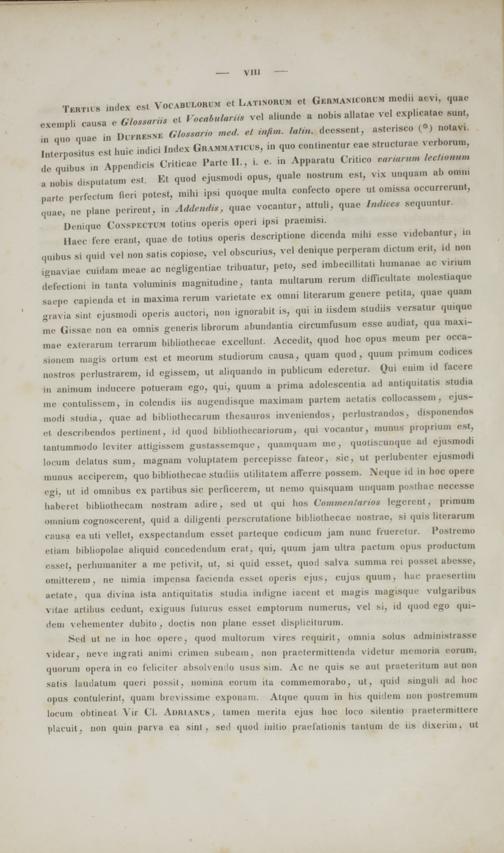 Tertiis index est Vocabulorum ct Latinorum et Germanicorum medii aevi, quae exempli causa e Glossariis et Vocabulariis vel aliunde a nobis allatae vel explicatae suni. in quo quae in DuFRJESNI Glossario med. et infim. latin. deessent, asterisco (*) notavi. [nterpositus est huic indici Index Git ammaticus , in quo continentur eae structurae verborum, de quibus in Appendicis Criticae Partc II., i. e. in Apparatu Critico variarum lectionum a uobis disputatum est. Et quod ejusmodi opus, quale nostrum cst, vix unquam ab omni parte perfectum fieri potest, mihi ipsi quoque multa confecto opere ut omissa occurrerunt, quae, ne plane pcrirent, in Addendis, quac vocantur, attuli, quae Indices sequuntur. Denique Conspectum totius operis operi ipsi praemisi.