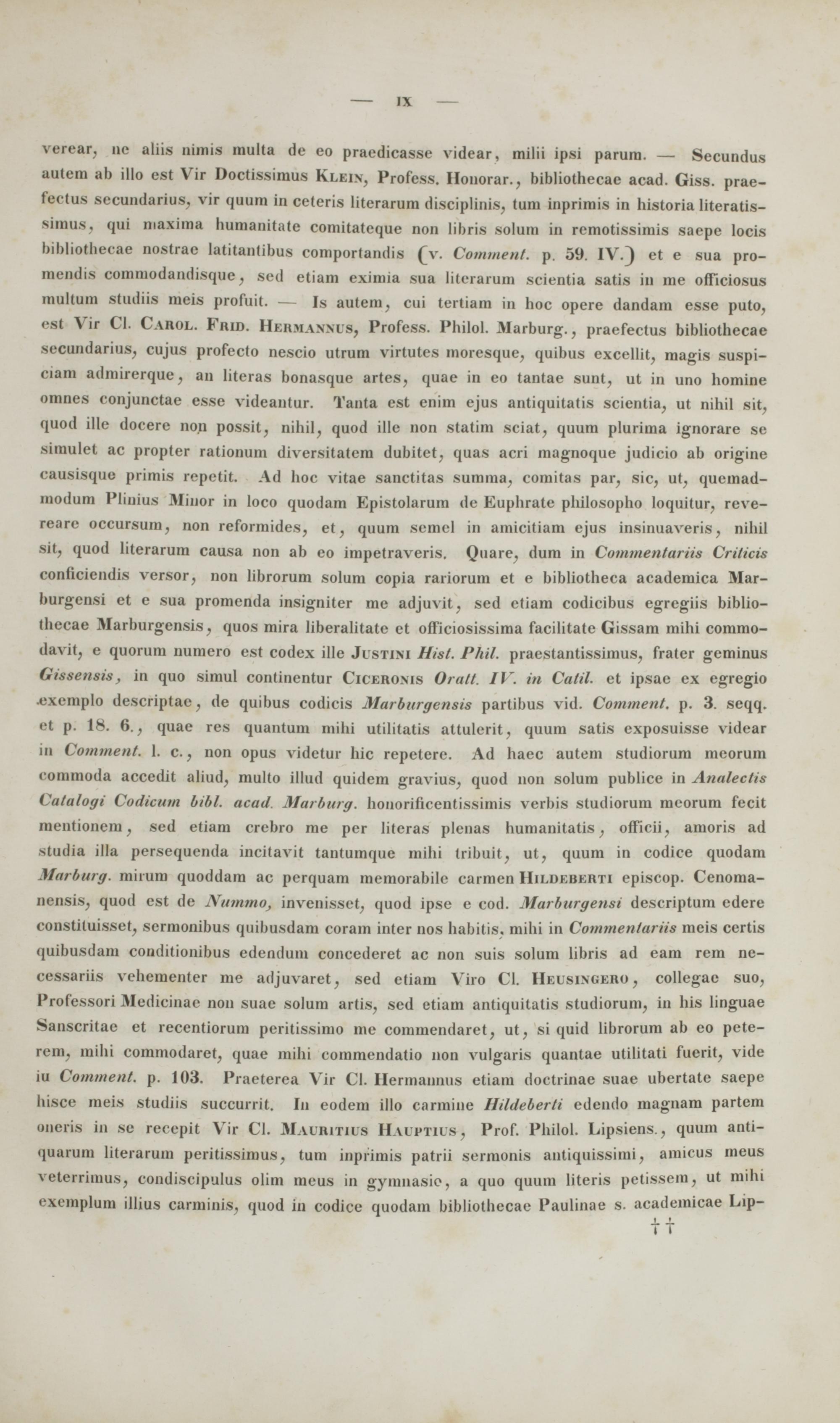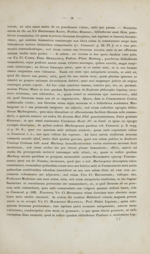 verear, ne aliis nimis muita de eo praedicasse videar, milii ipsi parum. — Secundus autem ab illo est Vir Doctissimus Klein , Profess. Honorar., bibliothecae acad. Giss. prae- fectus secundarius, vir quum in ceteris literarum disciplinis, tum inprimis in historia literatis- simus. qui maxima humanitate comitateque non libris solum m remotissimis saepe locis bibliothecae nostrae latitantibus comportandis (V. Comment. p. 59. IV.) et e sua pro- inendis commodandisque, sed etiam eximia sua literarum scientia satis in me officiosus multum studiis meis profuit. — Is autem, cui tertiam in hoc opere dandam esse puto, est Vir Cl. Carol. Frid. Heumanm s , Profess. Philol. Marburg., praefectus bibliothecae secundarius, cujus profecto nescio utrum virtutes moresque, quibus excellit, magis suspi- ciam admirerque, au literas bonasque artes, quae in eo tantae sunt, ut in uno homine omnes conjunctae esse videantur. Tanta est enim ejus antiquitatis scientia, ut nihil sit, quod ille docere non possit, nihil, quod ille non statim sciat, quum plurima ignorare se simulet ac propter rationum diversitatem dubitet, quas acri magnoque judicio ab origine causisque primis repetit. Ad hoc vitae sanctitas summa, comitas par, sic, ut, quemad- modum Pliuius Minor in loco quodam Epistolarum de Euphrate philosopho loquitur, reve- reare occursum, non reformides, et, quum semel in amicitiam ejus insinuaveris, nihil sit, quod literarum causa non ab eo impetraveris. Quare, dum in Commentariis Crilicis conficiendis versor, non librorum solum copia rariorum et e bibliotheca academica Mar- burgensi et c sua promenda insigniter me adjuvit, sed etiam codicibus egregiis biblio- thecae Marburgensis, quos mira liberalitate et officiosissima facilitate Gissam mihi commo- davit, e quorum numero est codex ille Justini Hist. Phil. praestantissimus, frater geminus Gissensis, in quo simul continentur Ciceronis Oratt. IV. in Calil. et ipsae ex egregio .exemplo descriptae, de quibus codicis Marburgensis partibus vid. Comment. p. 3. seqq. et p. 18. 6., quae res quantum mihi utilitatis attulerit, quum satis exposuisse videar in Comment. 1. c., non opus videtur hic repetere. Ad haec autem studiorum meorum commoda accedit aliud, multo illud quidem gravius, quod non solum publice in Analeclis Catalogi Codicum bibl. acad. Marburg. honorificentissimis verbis studiorum meorum fecit mentionem, sed etiam crebro me per literas plenas humanitatis, officii, amoris ad vtudia illa persequenda incitavit tantumque mihi tribuit, ut, quum in codice quodam Marburg. mirum quoddam ac perquam memorabile carmen Hildeberti episcop. Cenoma- nensis, quod est de Nummo, invenisset, quod ipse e cod. Marbtirgensi descriptum edere constituisset, sermonibus quibusdam coram inter nos habitis. mihi in Commentariis meis certis quibusdam conditionibus edenduni concederet ac non suis solum libris ad eam rem ne- cessariis vehementer me adjuvaret, sed etiam Viro CL Helsingero , collegac suo, Professori Medicinae non suae solum artis, sed etiam antiquitatis studiorum, in his linguae Sanscritae et recentiorum peritissimo me commendaret, ut, si quid librorum ab eo pete- rom. mihi commodaret, quae mihi commendatio non vulgaris quantae utilitati fuerit, vide iu Comment. p. 103. Praeterea Vir Cl. Hermannus etiam doctrinae suae ubertate saepe hisce meis studiis succurrit. In eodem illo carmine Hildeberti edendo magnam partem Biierifl in se recepit Vir Cl. Malritils Hauptils , Prof. Philol. Lipsiens., quum anti- quarum literarum peritissimus, tum inprimis patrii sermonis antiquissimi, amicus meus veterrimu.s, condiscipulus olim meus in gymnasie, a quo quum literis petissem, ut mihi exeniplum illius carminis, quod in codice quodam bibliothecae Paulinae s. academicae Lip-
