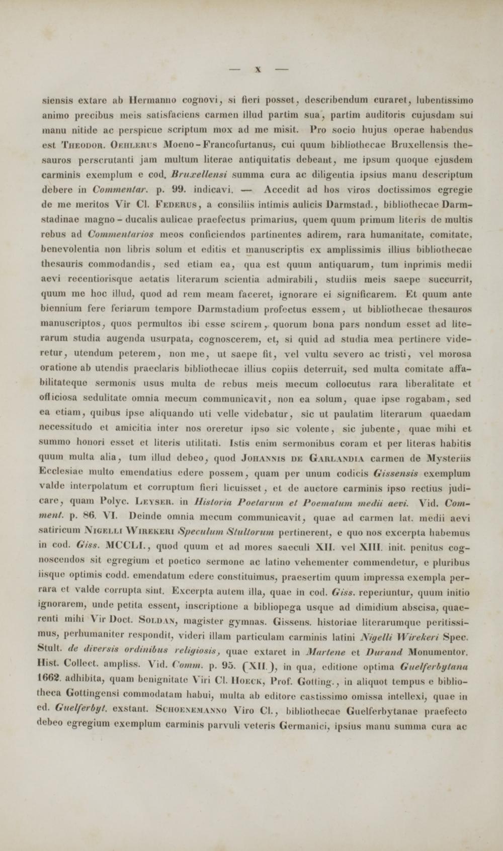 ■iensis extaic ab llcrnianno cognovi, si fteri possol . dcscribendum curarct, lubentissimo anirao preoibua meia satisfaciena oarmen Ulad partim sua, partim auditoria cajusdam aui manu nitide ac perspicue scriptum mox ad me misit. Pro socio hujua operac habendus csi Thiodoh. Oihlbrus Bfoeno- Krancofuriaiius. cui quum bibliothecae Bruzellensis ihe- sauros perscrutanti jam multum literae antiquitatig debeaut, me Ipsum quoque ejoadem carminis exemplum e cod. Bruxellemi summa cura ac diligentiu ipsius manu descriptum debere in Commentar. p. 1)9. indicavi. — Accedil ad hoa viros doctissiraos egregie de me mcritos Vir Cl. Fedkiius , a consiliis intimis aulicis Darmstad., bibliothecae Darm- stadinac magno - ducalis aulicae praefeclus primarius, quem quuin primuin Uteria de multis rebua ad Commantarioe meoa conflciendos partinentes adirem, rara liumanitate, comitate, benevolentia non libris aolum el editis et manuscriptis ex amplissiraia illius bibliotheoae theaauria comniodandis, sed etiam ca, qua est qoum antiquarum, tum Inprimia medii aevi reeentiorisque aetatis literarum scientia admirabili, studiia meia saepe succurrit, quum mo hoc illud, quod ad rem meam faceret, ignorarc ei significarem. Et quum ante bicnniuni fere feriarum tempore Darmstadium profeetoa assem, ut bibliothecae thesauroa manuscriptos, quos permultos ibi ease Bcirera, quorum bona pars nondum esset ad litc- rarum studia augenda usurpata, cognoscerem, et, si quid ad stadia mea pertinere vide- retur, utendum peterem, non me, ut saepe lii, vel vultu severo ac tristi, vel moreaa oratione ab utendis praeclaria bililiotbecae illius copiis deterruil, sed niulta oomitate affa- bilitateque sermonis usus multa de rebus meia mecura oollocutus rara liberalitate et ofliciosa sedulitate omnia mecum communicavit, non ea solum, quac ipse rogabam. sed ca etiam, quibus Ipse aliquando uti velle videbatur, sic ut paulatim literarum quaedam necessitudo ct amicitia inter nos oreretur ipso sic volente, sic jubcnte, quae mihi et summo houori esset el literis utilitati, Istis enim sermonibua coram et per iiteras habitis quum muita alia, tum illud debeo, quod Johannis di Gahlandu carmea de Mysteriis Bcclesiae multo emendatius edere possem . quam per unum codicis Gito en t it exemplum valde interpolatum et corruptum Beri licuissel . el de auctore carminis ipso rectius judi- care, quain Polyc. Leysir . in HUtoria Poetarum ti Poematum medn aeai. Vid. Com- mtnt. p, 86, VI. Deinda onuiia mecum communicavit, quae ad oarmen lat. medii aevi satirieum Visklli Wirkkkri Sptculum Stultorum pertinerent, e quo noa exeerpta babemus in cod. Oitt. MCCLI. , qnod quum et ad mores saeculi XII. vel XIII. init penitus cog- nosoendos sii egregium et poetico sermone ac latino vehementer commendetur, e piuribus Iisque optimis codd. emendatum edere constituimus, praesertim quura impressa exempla per- rara e( valdc corrupta siut, Excerpta autem illa, quae in cod. Gitt. reperiuntur, quuro initio Ignorarem, unde petita essent, inscriptione n bibliopega usque ad dimidium abscisa, quae- renti mibi Vir Doct. Soldan , magister gymnas. Gissens. historiae literarumque peritissi- mus, perhumaniter respondit, videri iilam particulam carminis latini NigolU Wirekeri Spec Stult. de ditereit ordinibue reHgiotie, quae extarel in Martene el Durand Ifenumentor. Hist Collect ampliss. Vid. Comm. p. 95, ("XII. ), in qua, editione optima Guelferbptana 1669, adhibita, quam benignitate Viri Cl. Hokck , 1'rof. Gotting., in aliquol tempus e biblio-