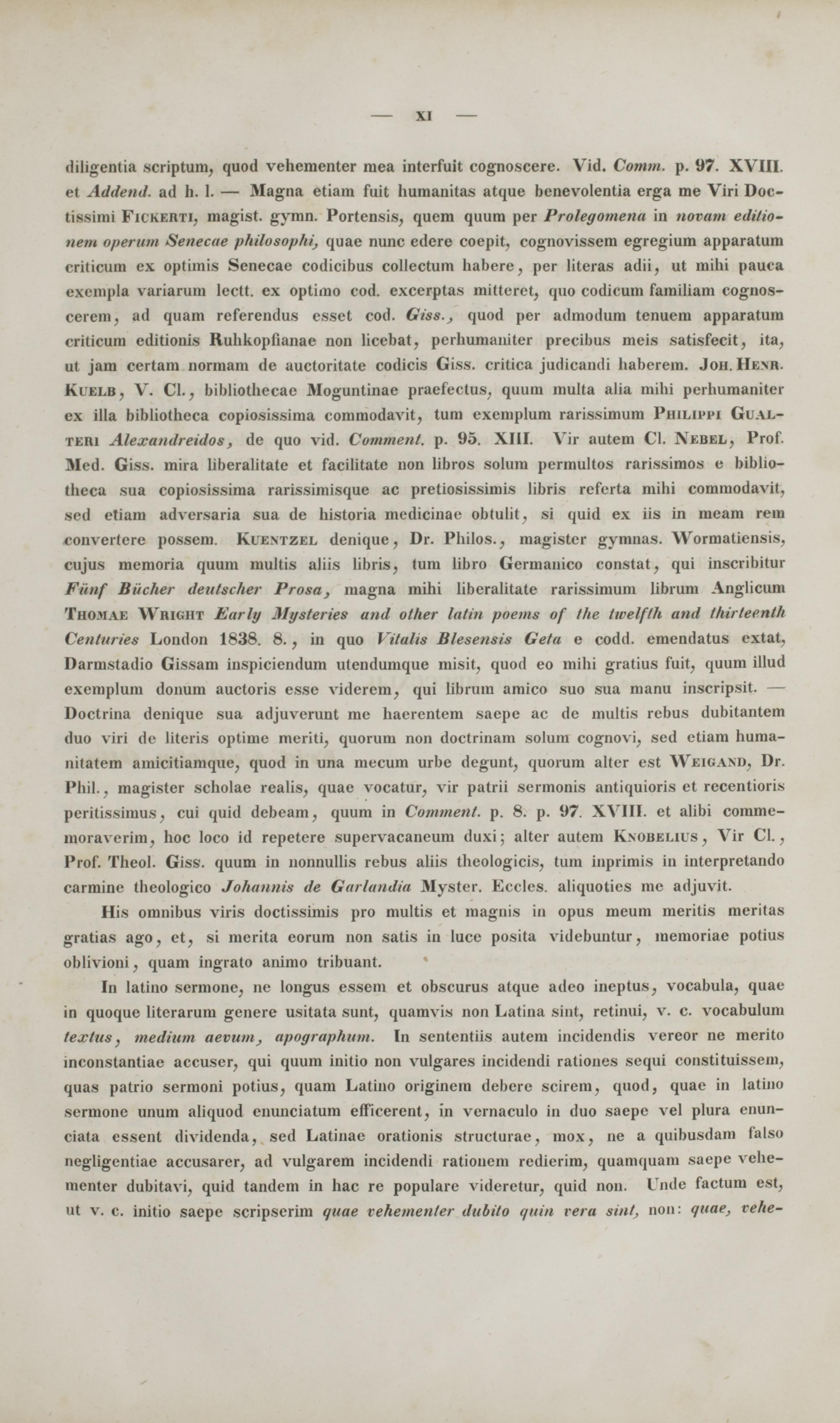 diligentia scriptum, quod vehementer mea interfuit cognoscere. Vid. Comm. p. 97. XVIII. et Addend. ad h. 1. — Magna etiam fuit humanitas atque benevolentia erga me Viri Doc- tissimi FlCKIRTI, magist. gymn. Portensis, quem quum per Prolegomena tn novam edilio- nem operum Senecae philosophi, quae nunc edere coepit, cognovissem egregium apparatum criticum ex optimis Senecae codicibus collectum habere, per literas adii, ut mihi pauca exempla variarum lectt. ex optimo cod. excerptas mitteret, quo codicum familiam cognos- cerem, ad quam referendus esset cod. Giss., quod per admodum tenuem apparatum «riticum editionis Ruhkopfianae non licebat, perhumaniter precibus meis satisfecit, ita, ut jam certam normam de auctoritate codicis Giss. critica judicandi haberem. Joh. Henr. Kuelb . V. Cl., bibliothccae Moguntinae praefectus, quum multa alia mihi perhumanitcr ex illa bibliotheca copiosissima commodavit, tum exemplum rarissimum Philippi Gual- teri Alexandreidos, de quo vid. Comment. p. 95. XIII. Vir autem Cl. Nebel , Prof. Med. Giss. mira liberalitate et facilitate non libros solum permultos rarissimos e biblio- tlieca sua copiosissima rarissimisque ac pretiosissimis libris rcferta mihi commodavit, sed etiam adversaria sua de historia mcdicinac obtulit, si quid ex iis in meam rem < nn\ ei tere possem. Kuentzel denique, Dr. Philos., magister gymnas. Wormatiensis, cujus memoria quum multis aliis libris, tum libro Germanico constat, qui inscribitur Fiinf Biicher detitscher Prosa, magna mihi libcralitate rarissimum librum Anglicum Tho.mae Wright Early Mysteries and other latin poems of fhe twelfth and thirteenth Centuries London 1838. 8., in quo Vitalis Blesensis Geta e codd. emendatus extat. Darmstadio Gissam inspiciendum utendumque misit, quod eo mihi gratius fuit, quum illud exemplum donum auctoris esse viderem, qui librum amico suo sua manu inscripsit. — Doctrina denique sua adjuverunt me haerentem saepe ac de multis rebus dubitantem duo viri de literis optime meriti, quorum non doctrinam solum cognovi, sed etiam huma- nitatem amicitiamque, quod in una mecum urbe degunt, quorum alter est Weigand , Dr. Phil.. magister scholae realis, quae vocatur, vir patrii sermonis antiquioris et recentioris peritissimus, cui quid debeam, quum in Comment. p. 8. p. 97. XVIII. et alibi comme- moraverim, hoc loco id repetere supervacaneum duxi; alter autem Knobelius , Vir Cl., Prof. Theol. Giss. quum in nonnullis rebus aliis theologicis, tum inprimis in interpretando carminc theologico Johannis de Garlandia Myster. Ecclcs. aliquoties me adjuvit.