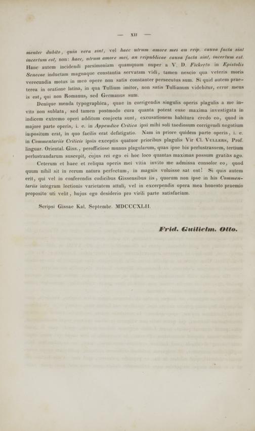 mentei dubito, qttin rera sinl, vel haec Ulrum umore mei an rei/i. cattsa facta tint incertum est, non: haec, ti/riitn aniore tnei, an reipublicae causa facta sint, incertum est. Hanc autem incidendi parsimoniam quamquam nuper a V. I). Fickerlo in Epiatoti» Senecae inductain magnaque constantia servatam vidi, tamen nescio qua veteri» mori.s verecundia motus in meo opere non satis constanter persecutus sum. Si quid autem prfte- terea in oratione latina, in qua Tullium imitor, non satis Tullianum vidcbitur, error meua is est, qui non Romanus, sed Germanus sum.