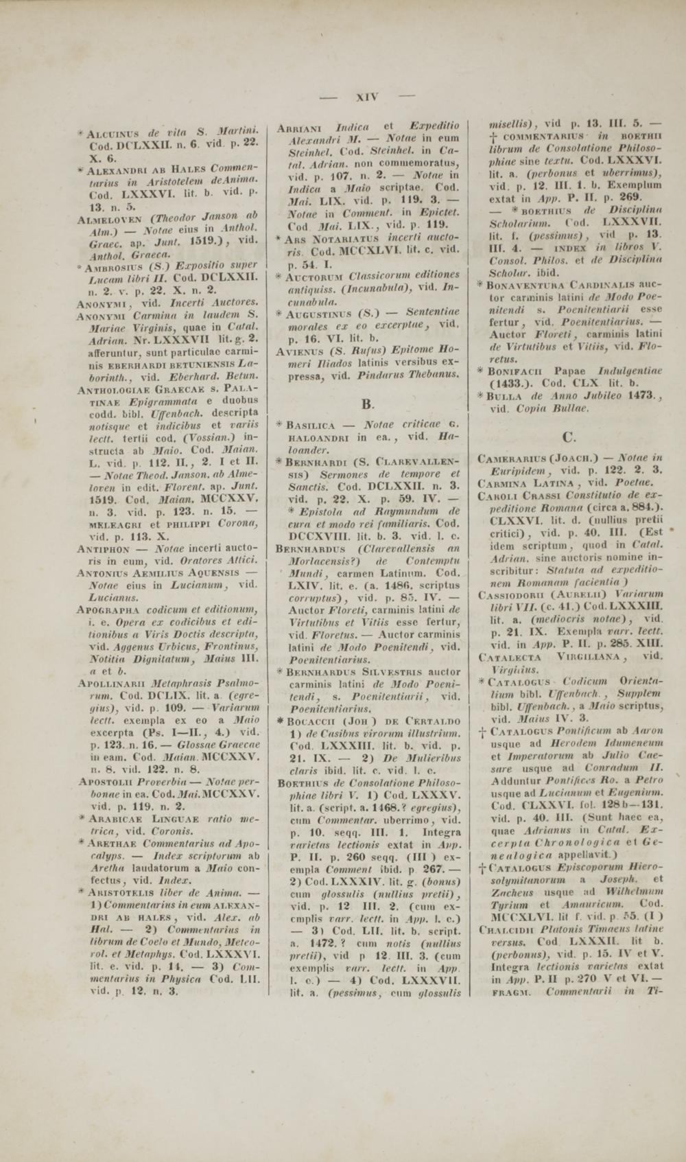 Berxhardus (Clarerallensis an Morlticensis?) de Contemptu Mundi, cannen Latinum. Cod. LXjrV. lit. e. (a. 1486. scriptus corruptiis) , vid. p. 85. IV. — Auctor Floreti, cariuinis latini de Yirtutibiis et Yitiis esse ferlur, vid Florelns. — Auctor canninis lalini de Motlo Poenitendi , vid. Poenitentitirins.