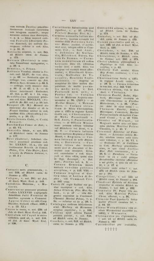 ariatharbe Sarracenicum qnid signiflcet , v. p. 57. {Proloy. Fretell Descript. Terr. S.) armina nonniilla latina me- d i i aevi, qtiorum exempla rel iinmiiiii dedit Polycarp Ley- s c r Histor. poemat. et poetar. ! med.aeri, intfgra edita in Com- ment. Crit., v. Ind. Auct. , ; v. Joliannes de Garlau- dia, Hildebert. Turon. Sa- ' tira de Xiiinnio. — Carmi- n u m n o ii ii ii 11 o r ii in ab codem Leysero libro cit. editorum rai iue lect. e codd. Giss. vel intejrrae vel excmpli causa affer- runtiir, v. Eberhardi Grae- Biata, G a I f r i d ii s d e V i- nosalvo, Ilenricus Septi- niellensis. — Augctur et completur ille liber nostra dis- putatione de multis poeina- tis medii aevi, v. tnd. Poetaruin mcd. aev., v. Poetae lat. — Cariuina lat. tle Mulierum Xeqiiitia enu- inerantiir p. 96. (XIV.) — ,le Mni ibus Mcnsue , v. M e n s a e Mores. — C a r m e n i r r i s 0- rium de Secla Chorizantiinn, quae a. 1375 in rcgione Leodii exorta est, v. C h o r i za n t es — de M o d o P o e n i t e n d i v. lnd. Anrt., v. Poenitentia- rius. — ile Officio Missae nune primum editum trihuitur vel Hildeberto tel Ivoni, v. p. 85. V. — Carmen latinum ' incerti iuctbris Hcyimcn et Stntus ftvtidi, v. Regiinen. — Car- mcn latinuiO ile ttrVe Dacen- triu, v. Daventria. — Car- m i ii a I a 1 1 n a duo breriora meilii aeri tle Jutcntute et Se- nictntc cum interpret. Germ. vet. ertiendttins e rod. Gucl- fcrb. et edita, qtiam Olim