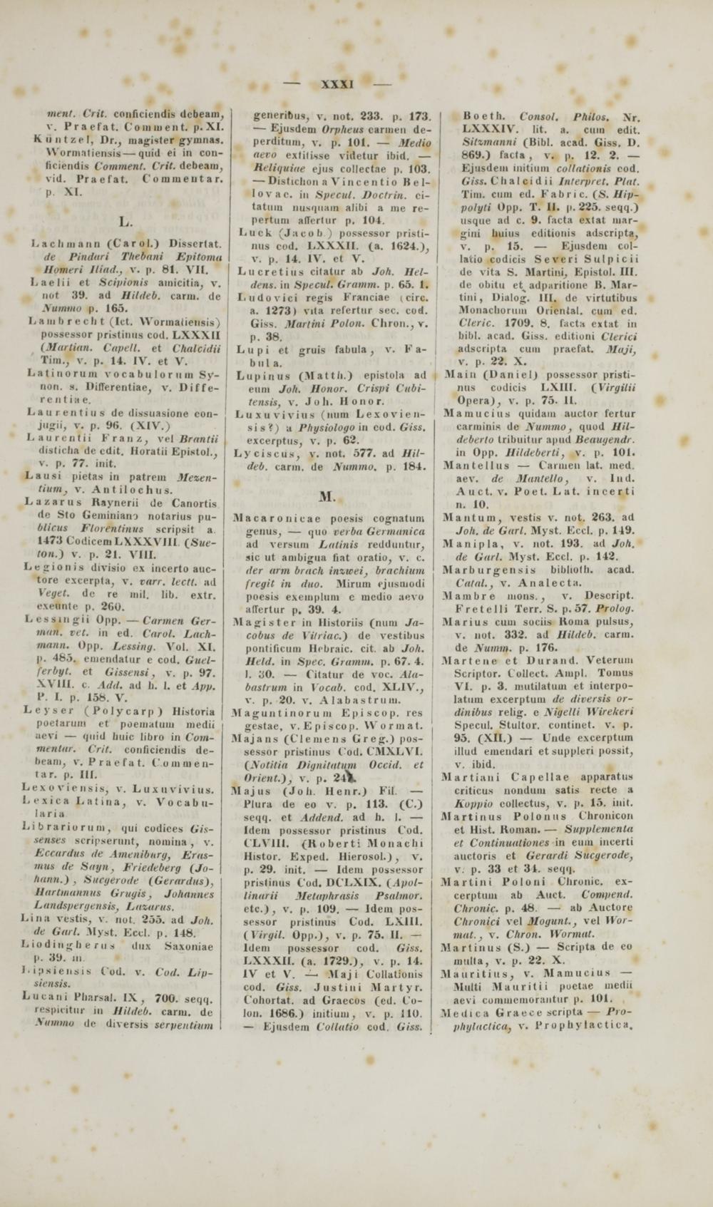 tium, v. A n t iI o c h ii s. Lazarus Haynerii de Canortis de Sto Gwnlhtam notarius pu- blicus Vlorentinus scripsit a. 1473 Codicem LXXXVIII (S«e- ton.) v. p. 21. VIII. Legiouia divisio ex incerto auc- tore excerpta, v. rnrr. lectt. ad Veget. de re inil. lib. extr. cxeiinte p. 260. Lessingii Opp. — Carmen Ger- man. tet. in ed. Carol. Lach- a jM. Opp. Lessiny. Vol. XI. p. 485. cmendatur c cod. Guel- ferbyt. et Gissensi, v. p. 97. XVIII. c. Add. ad b. I. et App. V. I. p. 158. V. Leyser (Polycarp) Historia poetarum et poeinatuin medii aevi — quid buic libro in Com- menlar. Crit. conficiciidis de- beani, v. Praefat. Comnien- tar. p. III. Lexo viensis, v. Luxuvivius. L e x i c a L a 1 1 n a, v. V o c a b u- laria