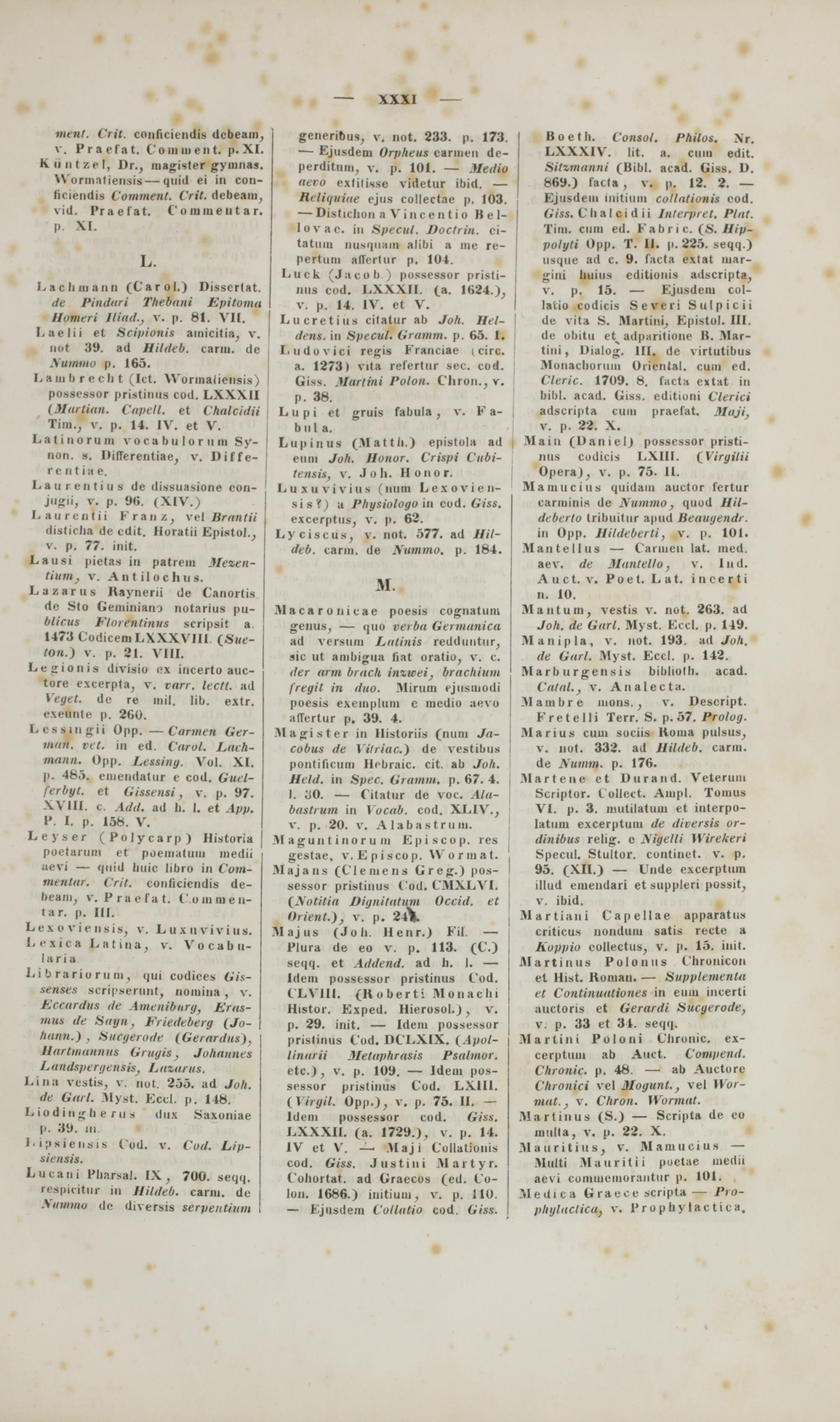 Boetli. Consol. Philos. Nr. LXXXIV. lit. a. cmn edit. Sitzmanni (Bibl. acad. Giss. D. 869.) facla, v. p. 12. 2. — Ejiisdem iiiitium collationis cod. Giss. Clialcidii Inlerpret. Plttt. Tim. ciini cd. Kabnc. (S. Ilip- polyli Opp. T. II. p. 225. seqq.) usque ad c. 9. facta extat mar- gini liuiiis cditionis adscripta, v. p. 15. — Ejusdem col- latio codicis Severi Sulpicii de vita S. Martini, Epistol. III. de obitu et adparitione B. Mar- tini , Dialog. III. dc virtutibus Moiiaclioriini Uticntal. cuin ed. Cleric. 1709. 8. facta e«tat in bibl. acad. Giss. editiuni Clerici adscripta CHJU praefat. Maji, v. p. 22. X. Maiu (Daniel) possessor pristi- nua cudicis LXIII. (Yiryitit Opera), v. p. 75. II. Mamuciui quidani auctor fertur carminis de Xummo , quud Hii- deberlo tribiiitur apud Beauyendr. in Opp. Hildeberti, v. p. 101. Mantellus — Caruien lat. med. aev. de Mantello, v. lud. Auct. v. Poet. Lat. incerti n. 10.