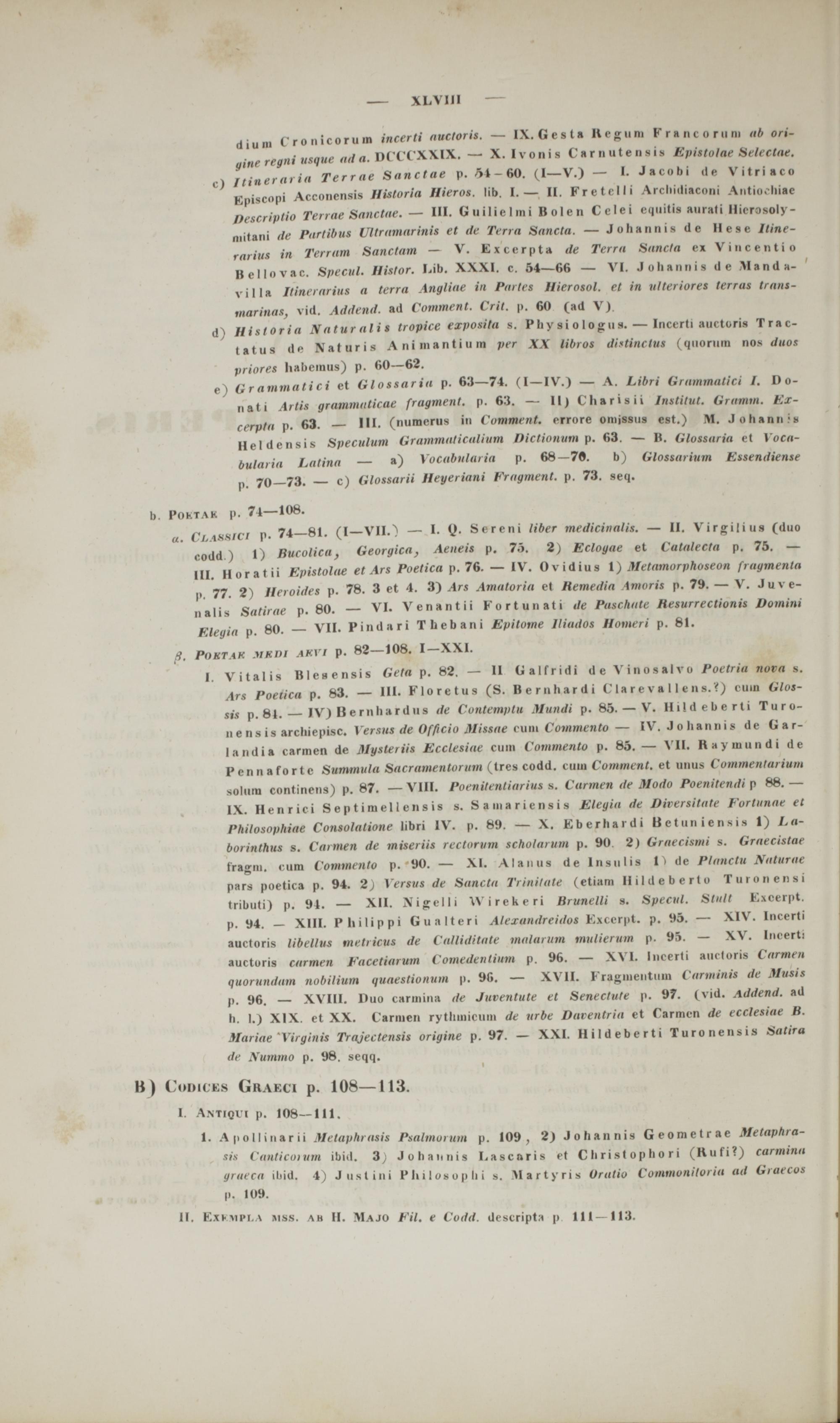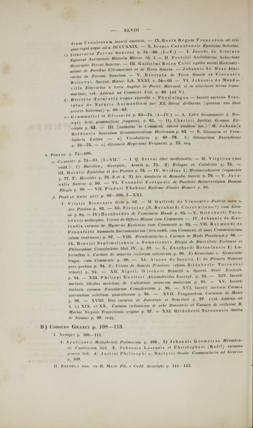 I. Vitalis Blenensis Geta p. 82. — II Galfridi de Vinosalvo Pottria ttot* s. Ars Poetica p. 83. — III. Floretus (S. Bernhardi ClareV» 11 ens. t) euin Glos- sis p. 81. — IV) Bernhard us dc Contemptu Munii p. 85. — V. Hildeberti Turo- ii e ns is archiepisc. Versus de Offlcio JHittae cum Commento — IV. Johannis de G a r- landia carmen de Jllysleriis Ecclesiae cuin Commente p. 85. — VII. Raymundi de Peniiafortc Summula Sacramt ntnrum (tres codd. cuui Comment, et niiu> Commentarium solum continens) p. 87. —VIII. Poenitentiariut a. Carmen tte Modo Poenitendi p 88.— IX. Henrici Septimellensis s. Samariensis Eleyia de Divertitate Vortunae et 1 'hitosophiae Consolatione libri IV. p. 89. — X. Eberhardi Betun ienaia 1) La- borinthus s. Cannen de miseriis rectorum tchoiarum p. 90. 2) Graccismi s. Graecistae fragm. cum Commento p. 90. — XI. Alanus de Insulis 1) de Planctu Naturae pars poetica p. 94. 2 ) Versus de Sancta Trinilate (etiam llildeberto Turonensi tributi) p. 94. — XII. Nigelli Wlrekeri BrunelU a. Speeul. Stn/t F..\cer[)t. p. 94. — XIII. Philippi Gualteri Alexandreidot Excerpt. p. 95. — XIV. Incerti auctoris libcllui metricut de Calliditate malarum mulierum p. 95. — XV. Incerti auctoris carmen Eacetiarum Comedenlium p. 96. — XVI. Ineerti auctoria Carmen quornndam nobilium qunestionum p. 96. — XVII. Fr»gmentum Cttrinniis dt Miisis p. 96. — XVIII. Duo carmina </<• Juventute tt Seneetute p. 97. (vid. Addend. ad h. I.) XIX. ct XX. Carmen rythmicum de urbe Daventria et Carmcn de ecclesiae B. Variae \iryinis Trajectenttt oriyine p. 97. — XXI. Hildeberti Turonensis Satira de tfummo p. 98. seqq.