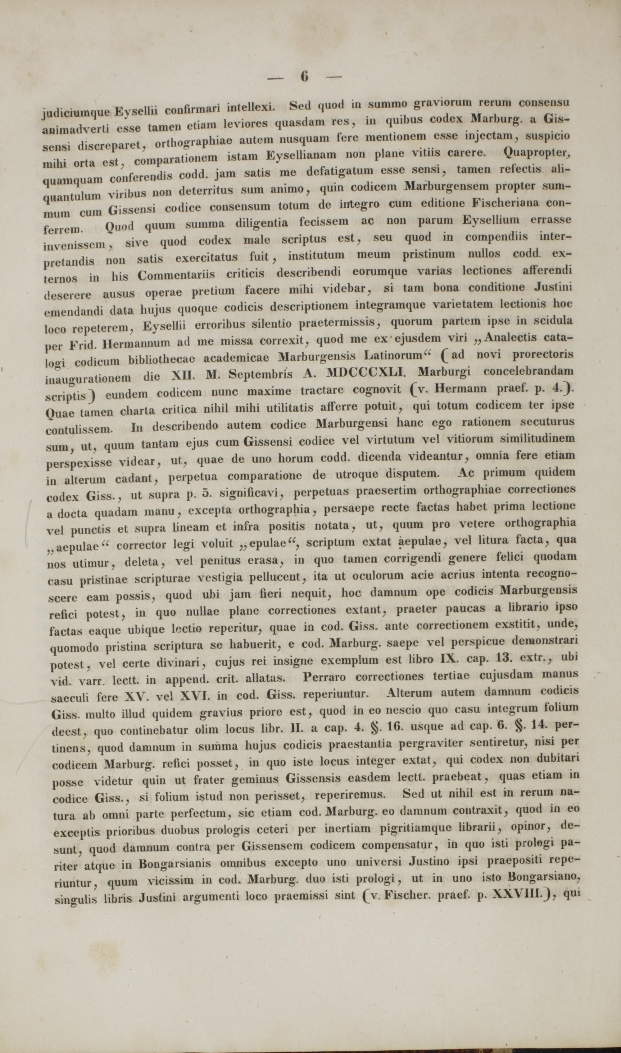 judiciumque Kvscllii confirmari intellexi. Scd quod in sumrao graviorum rerum consensu auimadverti esse tamen etiani leviores quasdam res, in quibus codex Marburg. a Gis- sensi discreparet, orthographiae autem nusquam fere mentionem csse injcctam, suspicio mihi orta cst, comparationem istam Eysellianam non plane vitiis carere. Quapropter, quamquam conferendis codd. jam satis me defatigatum esse sensi, tamen refectis ali- quantulum viribus non deterritus sum animo, quin codicem Marburgensem propter siun- Mum cum Gissensi codice consensum totum de iirtegro cum editione Fischeriana con- ferrem. Qtiod quum summa diligentia fecissem ac non parum Eysellium errasse iu\•cni.sscm , sive quod codex male scriptus cst, seu quod in compendiis inter- pretandis non satis exercitatus fuit, institutum meum pristinum nullos codd. ex- ternos in his Commentariis criticis describendi eorumque varias lectiones afferendi desercre ausus operae prctium facere mihi videbar, si tam bona conditione Justini ejnendandi data hujus quoque codicis descriptionem integramque varictatem lectionis hoc loeo repctcrcm, Eysellii erroribus silentio praetermissis, quorum partem ipse in scidula pcr Frid. Hennannum ad mc missa correxit, quod me ex ejusdem viri ,, Analectis cata- logi codicum bibliothecae academicae Marburgensis Latinorum'" Q ad novi prorectoris iuaugurationem die XII. 31. Septembris A. MDCCCXLI. Marburgi concelebrandam scriptis} eundem codicem nunc maxime tractarc cognovit (V. Hermann praef. p. 4.). Ouae tamen charta critica nihil mihi utilitatis afferre potuit, qui totum codicem ter ipse contulissem. In describendo autem codice Marburgensi hanc ego ratiouem secuturus sum, ut, quum tantam ejus cum Gissensi codice vel virtutum vel vitiorum similitudinem perspexisse videar, ut, quae de uno horum codd. dicenda videantur, omnia fere etiam in alterum cadant, pcrpetua comparatione de utroque disputem. Ac primum quidem codex Giss., ut supra p. 5. significavi, pcrpctuas praesertim orthographiae correctiones a docta quadam manu, excepta orthographia, persaepe recte factas habet prima lectione vel punctis et supra lineam et infra positis notata, ut, quum pro vetere orthographia j.aepulac" corrector legi voluit ,,epulae", scriptum extat aepulae, vel litura facta, qua nos utimur, deleta, vel penitus erasa, in quo tamen corrigendi genere felici quodam casu pristinae scripturae vcstigia pelluceut, ita ut oculorum acie acrius intenta recogno- scere eam possis, quod ubi jam fieri nequit, hoc damnum ope codicis Marburgensis refici potest, in quo nullae plane correctiones cxtant, praeter paucas a librario ipso factas eaque ubique lectio reperitur, quae in cod. Giss. ante correctionem exstitit, unde, quomodo pristina scriptura se habuerit, e cod. Marburg. saepe vel perspicue demonstrari potest, vel certe divinari, cujus rei insigne exemplum est libro IX. cap. 13. extr., ubi vid. varr. lcctt. in append. crit. allatas. Perraro correctiones tertiae cujusdam manus saeculi fere XV. vel XVI. in cod. Giss. reperiuntur. Alterum autem damnum codicis Giss. multo illud quidcm gravius priore est, quod in eo nescio quo casu intcgrum folium deest, quo contincbatur olim locus libr. II. a cap. 4. §. 16. usque ad cap. 6. §. 14. per- tinens, quod damnum in summa hujus codicis prae.stantia pergraviter sentiretur, nisi per codiccm Marburg. refici posset, in quo iste locus integer extat, qui codex non dubitari possc vidctur quin ut frater geminus Gissensis easdem lectt. praebeat, quas etiam in codice Giss., si folium istud non perisset, reperiremus. Sed ut nihil est in rerum na- tura ab omni partc perfcctum, sic etiam cod. Marburg. eo daninum contraxit, quod in eo exceplis prioribus duobus prologis ceteri per inertiam pigritiamque librarii, opinor, de- sunt, quod daranum contra per Gissensem codicem compcnsatur, in quo isti prolegi pa- riter atquc in Bongarsianis omnibus excepto uno universi Ju.stino ipsi praepositi repc- riuntur, quum vicissim in cod. Marburg. duo isti prologi, ut in uno isto Bongarsiano, singulis libris Justini argumcnti loco praemissi sint (v. Fischer. praef. p. XXVIII._), qui