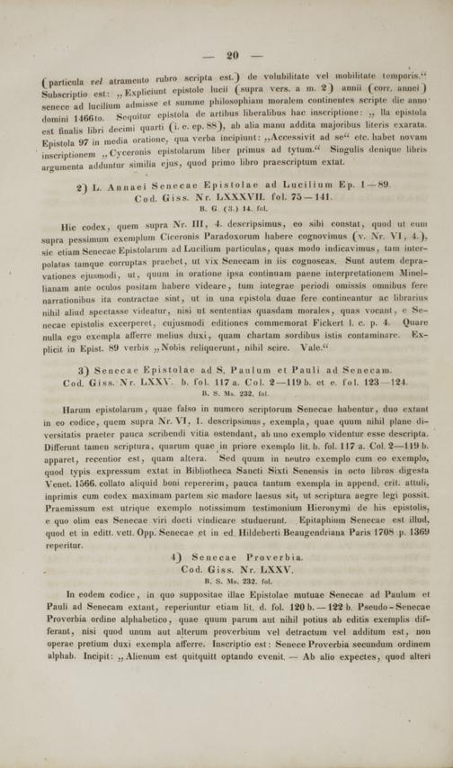 Ilic codex, quem supra Nr. III, 4. descripsimus, eo sibi constat, quod ut eum supra pessimum exemplum Ciceronis Paradoxorum habere cognovimus (v. Xr. VI, 4.). sic etiam Senecae Epistolarum ad Lucilium particulas, quas modo indicavimus, tam inter- polatas tamque corruptas praebet, ut vix Senecam in iis cognoscas. Sunt autem depra- vationes ejusmodi, ut, quum in oratione ipsa continuam paene interpretationem Minel- lianam ante oculos positam habere videare, tum integrae periodi omissis onmibus fere narrationibus ita contractae sint, ut in una epistola duae fere contineantur ac librarius niliil aliud spectasse videatur, nisi ut sententias quasdam morales, quas vooant, <• Se- necae epistolis excerperet, cujusmodi editiones commemorat Fickert I. c. p. 4. Quare nulla ego exempla afferre melius duxi, quam chartam sordibus istis contaminare. Ex- plicit in Epist. 89 verbis „Nobis reliquerunt, niliil scire. Vale."