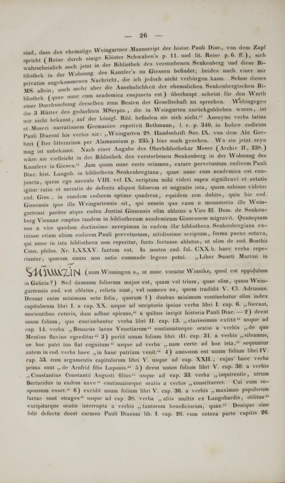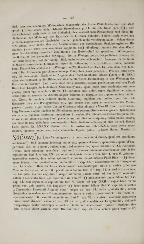 sind, dass das chcmaligc Wcingartner Manuscript der biator. Pauli Diac, voa dem /.upl spricht (Reise duroh einige Kldstcr Sohwaben'a p. 11. und lit. Reiae p. 6. h".), sich uahrscheinlich noch jetzt in dcr Bibliothck des verstorbenen Senkcnbcrg uad dicse Bi- liliothek in der Wohnung dea Kanzlcr's zu Giessen helindet; beidcs nach einer mir privatim zugekommencn Nachricht, die ich jedoch nicht vcrburgen kami. Schon dieaea MS. allcin, noch mehr aber die Anseluilichkcit der chemalichcii Scnkcnbcigischcn Bi- bliothek (quae nunc cum academica conjuncta est) iiberhaupt aoheiat fur dcn Werth eincr Durch8uchung dfcraelben ZUm Besten der Gesellschaft zu sprechen. Wohingegcn die 3 Bliitter des gedachten MScrpl.s., die in Weingarten zuriickgeblieben uaren, ist mir nicht bckannt, auf der konigl. Bibl. befinden sie sich nicht." Anonymi verba latina el Ifoaeri narrationem Germanicc repetivit Bethmann, I. c. p. 340. in Indice codicuni 1 'auli Diaconi his verbis sic: „Weingarten 28. Handschrift Sec. IX. von dem Abt Ger- bert (Iter litterarium per Alamanniam p. 235.) hier noch geaehen. Wo sie jetzt seyn mag ist unbekannt. Nach einer Angabe des Oberbibliothekar Moser (Archiv II, 238.) ware sie vielleicht in dcr Bibliothek des verstorbenen Senkenberg in der Wohnung des Kanzlers in Gicsen." Jam quum nunc certo sciamus, cxtare pervctustum codioem 1 'auli Diac. hist. Langob. in bibliolhcca Senkenbergiana, quae nunc cum acadcmica est con- juncta, quem ego saeculo VIII. vel IX. scriptum mihi videri supra signiiicavi et aetatis igitur ratio et narratio de defectu aliquot foliorum et migratio ista, quam subisse videtur cod. Giss., in eundcm codicem optime quadrcnt, equidem non dubito, quin hic cod. Gissensis ipse ille Weingartensis sit, qui nescio quo casu e monasterio illo Weiu- gartensi pariter atque codex Justini Gissensis olim ablatus a Viro 111. Dom. de Senken- berg Viennae emptus tandem in bibliothecam academicam Gissensem migravit. Quamquam nos a viro quodam doctiaaimo accepimus in eadcm illa" bibliotheca Senkenbcrgiana ex- titisse ctiam alium codicem 1 'auli pcrvetuskim, nitidissime scriptum, foima paene octava, qui nunc in ista bibliotheca non reperitur, furto fortasse ablatus, ut olim de cod. Boethii Cons. philos. Nr. LXXXV. factum est. In nostro cod. fol. CXX b. haec rerba repe- riuntur, quorum unum non satis commode legere potui. „Liber Sancti Martini in