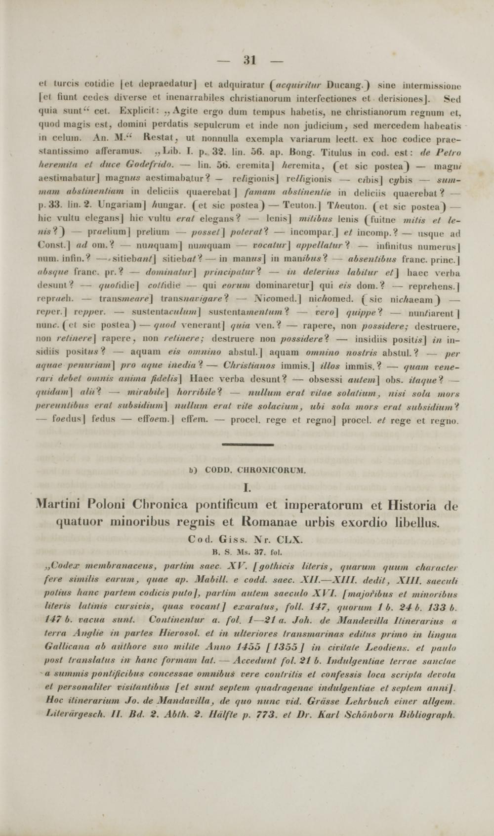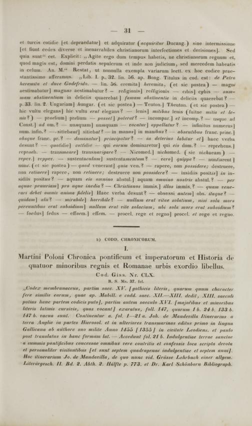 „Codex membranaceut, partim saec. XV. /go/hicis lileris, quarum quum charaeter fere similis eamm, quae up. Mabill. e codd. suec. XII.—XIII. dedit, XIII. taecuh polhu Itanc partem codicie puto], pmrtim autem taeculo XVI. fmajofibus et minoribut literit latinit curticie, qitus rocunt / exara/ut, fo/l. 147, quarum I 6. 24 b. 133 b. 147 b. raciiu sttnl. Conlincnlnr a. fol. 1—21 u. Joh. de MandevUla l/inerariut a lerra Anglie in partes Hierosol. el in ulteriores Iruiismarinus tditut primo in lingita Gallicana ab uitlhore suo miltle Anno /455 / 1355 ] iu civilale Leodiens. e/ pmulo fiosl trantlatus in hane formom h%t. — Accedun/ fol. 21 b. Indulgenliae terrae tanclae u aummit pentificibut concessue omnilms rere conlri/is e/ confessis locu acripta decota el personaliler vititantUnm /e/ sitn/ sep/em </ttudrugenue indulgentiue et septem annij. Hoc ilinerurium Jo. de Mandavilla, tle quo uiinc vid. Grusse Lehrbuch einer allgem. Literurgesch. II Bd. 2. Ablh. 2. Hulfle p. 773. et Dr. Karl Schonbom Htbliogruph.