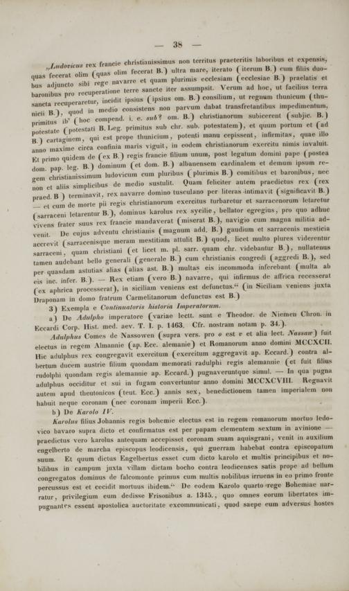 ,J,udovicus rex francie christianissimus non territus praeteritis laboribus et expensis. quas fecerat olim (quas olim fecerat B.) ultra mare, iterato (iterum B. ) cum filiis duo- bus adjuncto sibi regc navarre et quam plurimis ecclesiam (ecclesiae B.) praelatis et baronibus pro recuperatione terre sancte iter assumpsit. Veruni ad hoc, ut facilius terra sancta recuperaretur, ineidit rpsiUS ( ipsius om. B.) consilium, ut rcgnum thunicum (thu- nicii B.), quod in medio consistens non parvum dabat transfretantibus impedimentuni. primitus ib' (hoc compend. i. e. sub'* om. B.) christianorum siibicerent (subjic. B.) potestate (potestati B. Leg. primitus sub chr. sub. potestatem), et quum portum et (ad B.) cartaginem, qui est prope thunicium, poteuti manu cepissent, infirmita.s, quae illo anno maxime circa coniinia maris viguit, in eodem christianorum exercitu nimis invaluit. Et primo quidem de (ex B.) regis francie filium unum, post legatum domini pape ( postea dom. pap. leg. B. ) dominum (et dom. B.) albanensem cardinalem et demum ipsum re- gem christianissimum ludovicum cum pluiibus ( plurimis B.) comitibus et baronibus, nec non et aliis simplicibus de medio sustulit. Ouam feliciter autem praedictus rcx (rex praed. B ) terminavit, rex navarre domino tusculano per literas intimavit (significavit B.) — et cum de morte pii regis christianorum exercitus turbaretur et sarracenorum letarctur ( sarraceni letarentur B.), dominus karolus rex sycilie, bellator egregius, pro quo adhuc vivens frater suus rex francie mandaverat (miserat B.), navigio cum magna militia ad- venit. De cujus adventu christianis (magnum add. B.) gaudium et sarracenis mesticia accrevit (sarracenisquc meram nie.stitiam attulit B. ) quod, licet multo plures viderentur sarraceni, quam christiani (et licet m. pl. sarr. quam chr. videbantur B.), nullatenus tamen audebant bello generali (generale B.) cum christianis congredi (aggredi B.), sed per quasdam astutias alias (alias ast. B.) multas eis incommoda inferebant (multa ab eis inc. infer. B.). — Rex etiam (vero B.} navarre, qui infirmus de affrica recesscrut (ex aphrica processerat), in siciliam veniens est defunctus." (in Siciliam veniens juxta Draponam in domo fratrum Carmelitanorum defunctus est B.) 3) Exempla e Contimtaloris historia Iinperatorum.