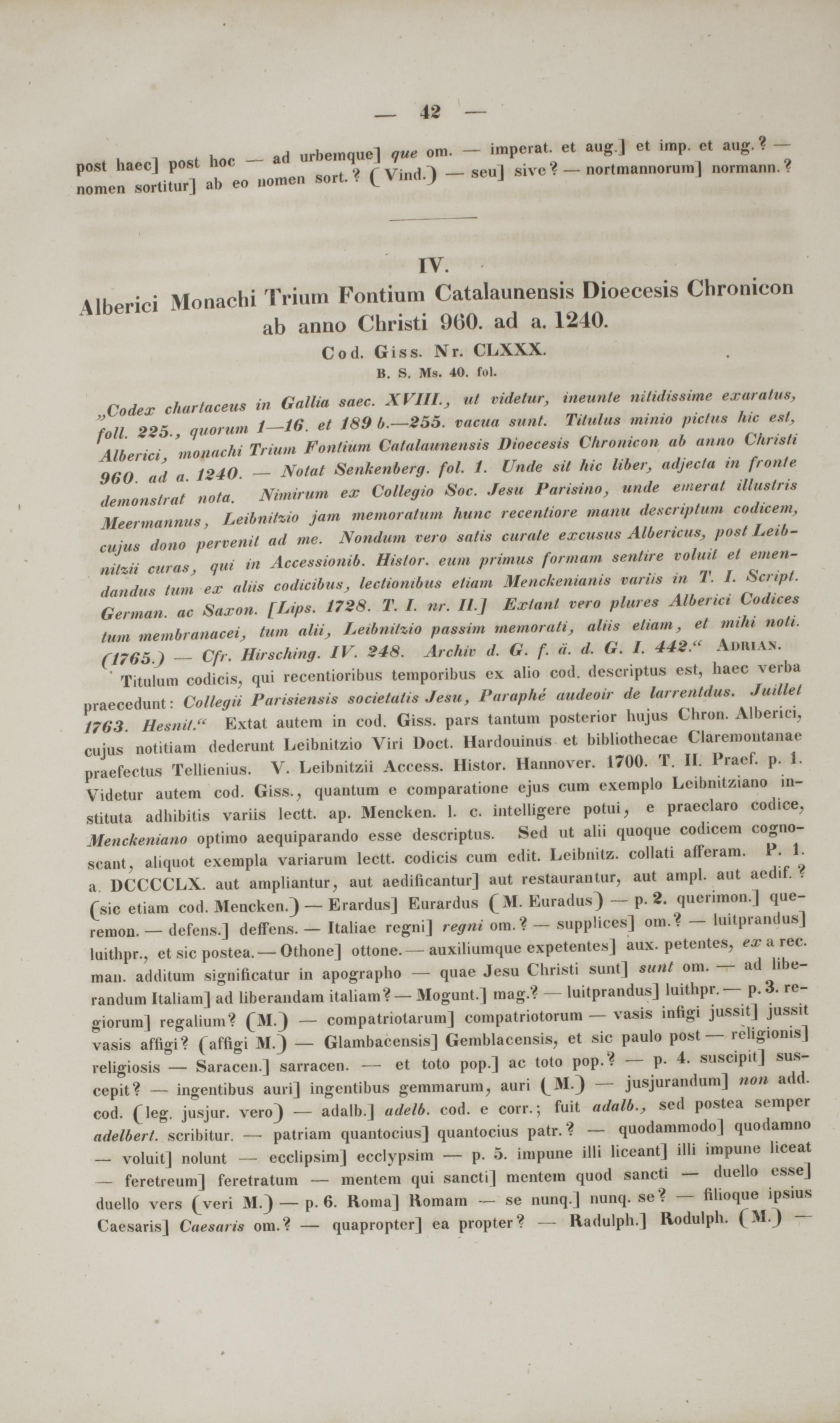 „Codex churtaceus in Gallia saec. XVIIL, ui videtur, ineunte nitidissime exaratus, foll. 225., quorum t — 16. et 189 b. — 255. vacita tunt. TUulus minio pictue hie esl, Alberici, monachi Triutn Fontium Gatalattnensis Dioecesis Chrotticon ab anno Chritlt 960. ad a. 1240. — Notat Senkenberg. fol. 1. Unde sil hic liber, adjecla in fronte demonetrat nota. Nimirum ex Collegio Soc. Je.su Parisino, unde einerat i/litslris Meermannus, Leibnitzio jam memoratum hunc recentiore tmiiiu descriptum codicem, cujus dono perveni/ ad tne. Nondum rero salis curale excusus Albericus, post Leib- nitzii curasj qm Aeeessionib. Histor. eum primus formam sentire voluit et emen- aandue tum e.r alns eodicibus, lectionibus etiam Menckenianis variis m T. I. Seript. German. ac Saxon. [Lips. 1728. T. I. nr. II. j Extant rero phtres Alberici Codices tum membranaeeij tum alii, LeibnitziO passim memorati, aliis eliam, et mihi noti. (1765.) — Cfr. Hirsching. IV. 248. Archiv d. G. f. a. d. 6. I. 442." Aimiw. Titulum codicis, qui recentioribus temporibus ex alio cod. descriptus est, haec verba praecedunt: Collegii Parisiensis societutis Jesu, Puraphi audeoir de larrentdus. Jtttllel 1763. Hesnit." Extat autem in cod. Giss. pars tantum posterior hujus Chron. Alberici, cujus notitiam dederunt Leibnitzio Viri Doct. Hardouinus et bibliothecae ClaremoUtaMe praefectus Tellienius. V. Leibnitzii Access. Histor. Hannovcr. 1700. T. II. Praef. p. 1. Videtur autem cod. Giss., quantum c comparatione cjus cum cxemplo Lcibnitziano in- stituta adhibitis variis lectt. ap. Menckcn. 1. c. intelligere potui, e praeclaro codice. Menckeniano optimo aequiparando esse desCriBtus. Scd ut alii quoque codicem cogno- scant, aliquot exempla variarum Iectt. codicis cum edit. Leibnitz. collati affcram. F. 1. a DCCCCLX. aut ampliantur, aut aedificantur] aut restaurantur, aut ampl. aut aedif. ? (sic etiam cod. Mencken.)—Erardus] Eurardus ("M. Euradus) — p. 2. querimon.J que- remou. — defens.] deffens.— Italiac rcgni] regni om.?—supplices) om.? — luitprandus] luithpr., et sic postea. — Othone] ottone.— auxiliumque expetentes | aux. petentcs, ex&rec. man. additum signihcatur in apographo — quae Jesu Christi sunt] sitnt om. — ad libe- randum Italiam] ad liberandam italiam?— Mogunt.] mag.? — luitprandusj luithpr. — p. 3. rc- giorum) regalium? — compatriotaium] compatriotorum — vasis infigi jussit] jussit