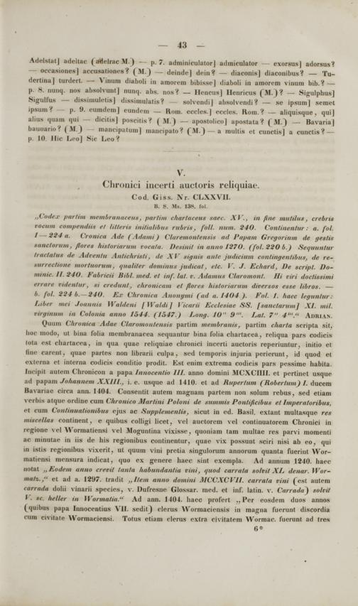 ,,Codex parthn membranaeeue, partim chartaceu* saec. XI'., in fine m utHuo , crebris rocum eompetuUt» tl lit/eris initiatibus riibrts, foll. num. 240. Centinentw .- «. fol. 1—224 a. Cronica Ade (Atlatni ) Claremontensis ad Paptm Gregorinm de geslis tanctorum, florei hietoriarum voeata. Deeinii in anno 127O. (fol.220b.) Sequuntur traetatue de Advenlu Antichrieti, de .XI' tignis ante judicium eontingentibus, de re- tmrrectione mortuorum } qualiter deminue judicat, elc. V. J. Echard, De script. Do- iiitnic. II. 240. FabrieH Bibl. med. et inf. lat. V. Adamu* Claromont. Hi riri doctissimi errare videntur, ei credunt,, chronicam et flores hietoriarum diversos esse libros. — (V fnl. 224 b. 240. Ex Chronica Anonymi (tul a. 1404 ). Fol. 1. haec leguntur: liiber mei Joannie Waldeni \\Yaldi\ Vicarii Eccleeiae SS. [sanctarumj XI. mii. nrfinum in Colonm mm 1544. (1547.) Long. 10" 9"'. Lat. 7" 4"'." Adrian. Quuin Chronica Adae Claromo nteneie partim membranis, partim charta scripta sit, boc modo, ut bina folia mcmbranacea sequantur bina folia cbartacea, reliqua pars codicis lota cst chartacca. in qua quae reliquiae chronici incerti auctoris reperiuntur, initio et fiae careutj quae partes non librarii culpa, sed temporis injuria perierunt, id quod et externi el interna codicis conditio prodit. Est enim extrema codicis pars pessime habita. Incipit autcm Chronicon a papa Innocentio 111. anno domiui MCXCIIII. et pertinet usque ad papam Johannem XXIII., i. c. usque ad 1410. et ad Rupertum (Robertum) I. ducem Bavanae circa ann. 1404. Consentit autem magnam partem non solum rebus, sed etiam verbis atque ordine cum Chronico Martini Poloni de summis Pontificibus et Imperatoribus, ci cum Contmuatiombue ejus ac Supplemenlis, sicut in ed. Basil. extant multasque res miscellas continent, e quibus colligi licet, vel auctorem vel continuatorem Chronici in regione vel Wormatiensi vel Moguntina vixisse , quoniam tam multae res parvi momenti ac urinutae in iis de his regionibus continentur, quae vix possunt sciri nisi ab eo, qui in istis regionibus vixerit , ut quum vini pretia singulorum annorum quanta fuerint Wor- matiensi mcnsura indicat, quo ex genere haec sint exempla. Ad annum 1240. haec notat ..Eotlem anno creri/ tanta habumlantia vini, quod carrata solvit XL denar. \Vor- ma/z: ." et ad a. 1297. trailit „Ilem anno domini MCCXCVII. carrata vini (_est autem carrada dolii vinarii species, v. Dufresne Glossar. mcd. et inf. latin. v. Carrada) solvil V, sc. heller in Wormatia." Ad ann. 1404. haec profert ., Pcr eosdem duos annos ^quibus papa Innocentius VII. sedif) clerus Wormacicnsis in magna fuerunt discordia cum civitate Wormaciensi. Totus etiam clerus extra civitatem Wormac. fuerunt ad tres