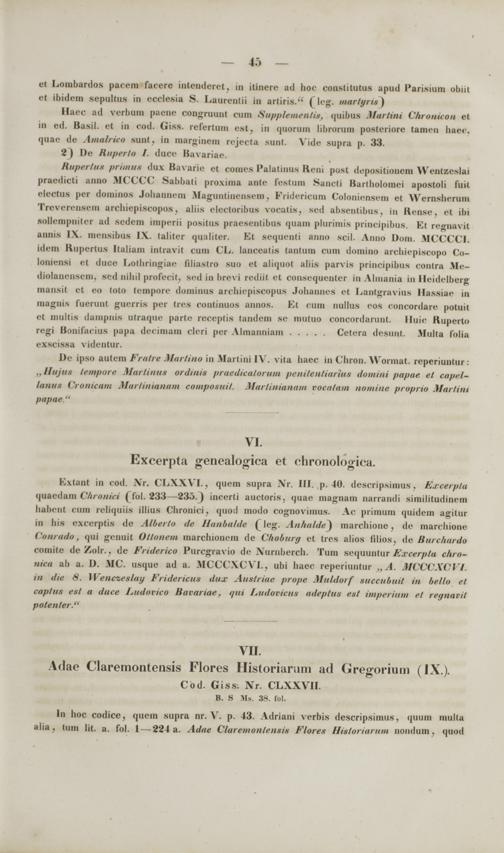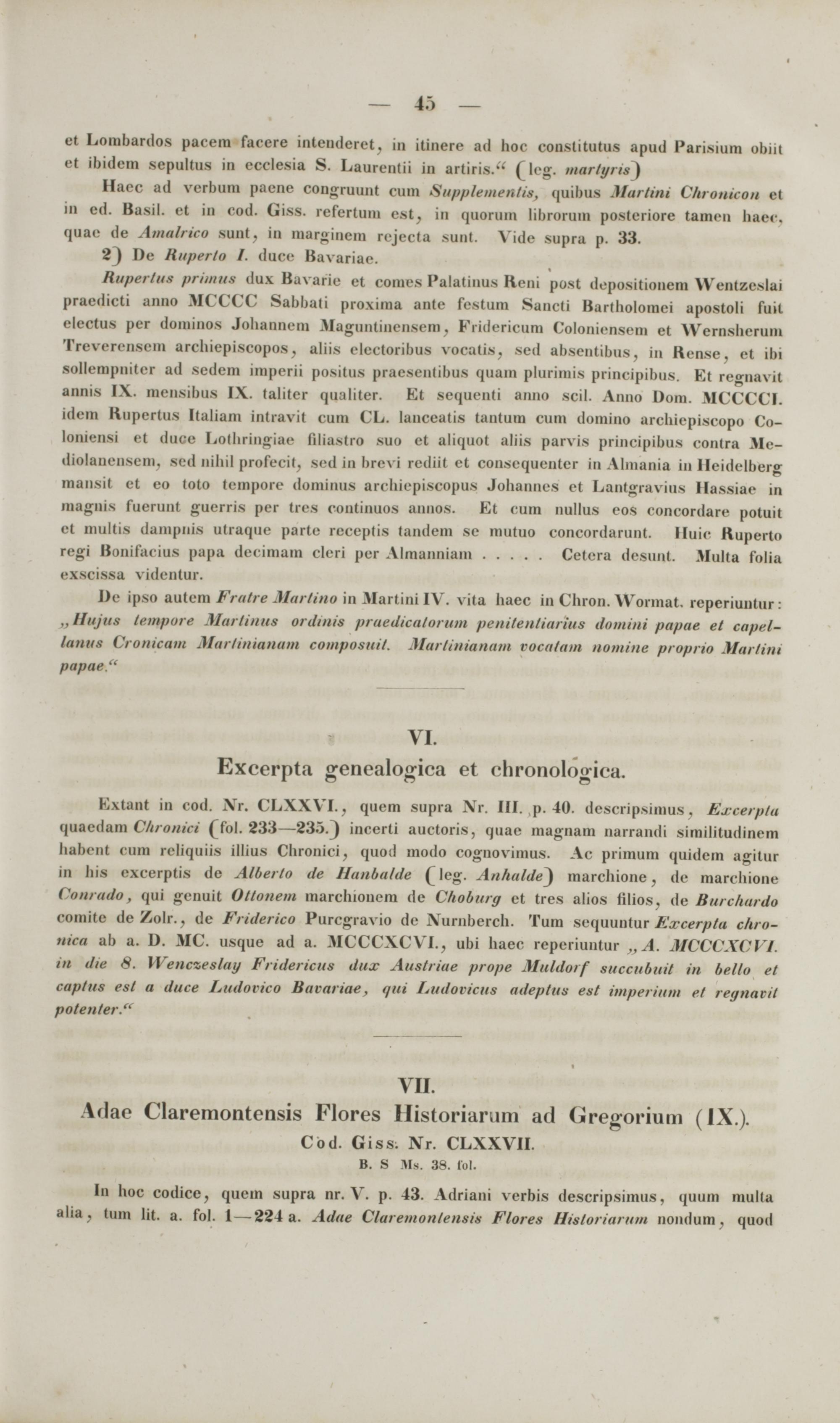 Bxtant in cod. Nr. CLXXVI., quem supra Nr. III. p. 40. descripsimus , Excerpta quaedam Chroniei (fbl. 233—235.J incerti auctoris, quae magnam narrandi similitudinem habent cum reliquiis iUius Cbronici, quod modo cognovimus. Ac primum quidem agitur in his excerptis de Alberto de Hahbalde (Jeg. Anhalde^ marchione, dc marchione Conrado, qui genuit Ottonem uarchionem de Choburg et tres alios iilios. de Burchardo comite deZolr.; de Friderieo Purcgravio de X r urnberch. Tum scquuntur Excerpta chro- uiid ab a. D. MC. usque ad a. MCCCXCVI., ubi haec reperiuntur „ A. MCCCXCVl. iii die 8. Weneseelay Friderieue dux Auetriae prope Muldorf eueeuhuil in bello et captus eet a duce Ludovico Bavariae, qui Ludovicus adeptus est imperium et regnavit potenter."