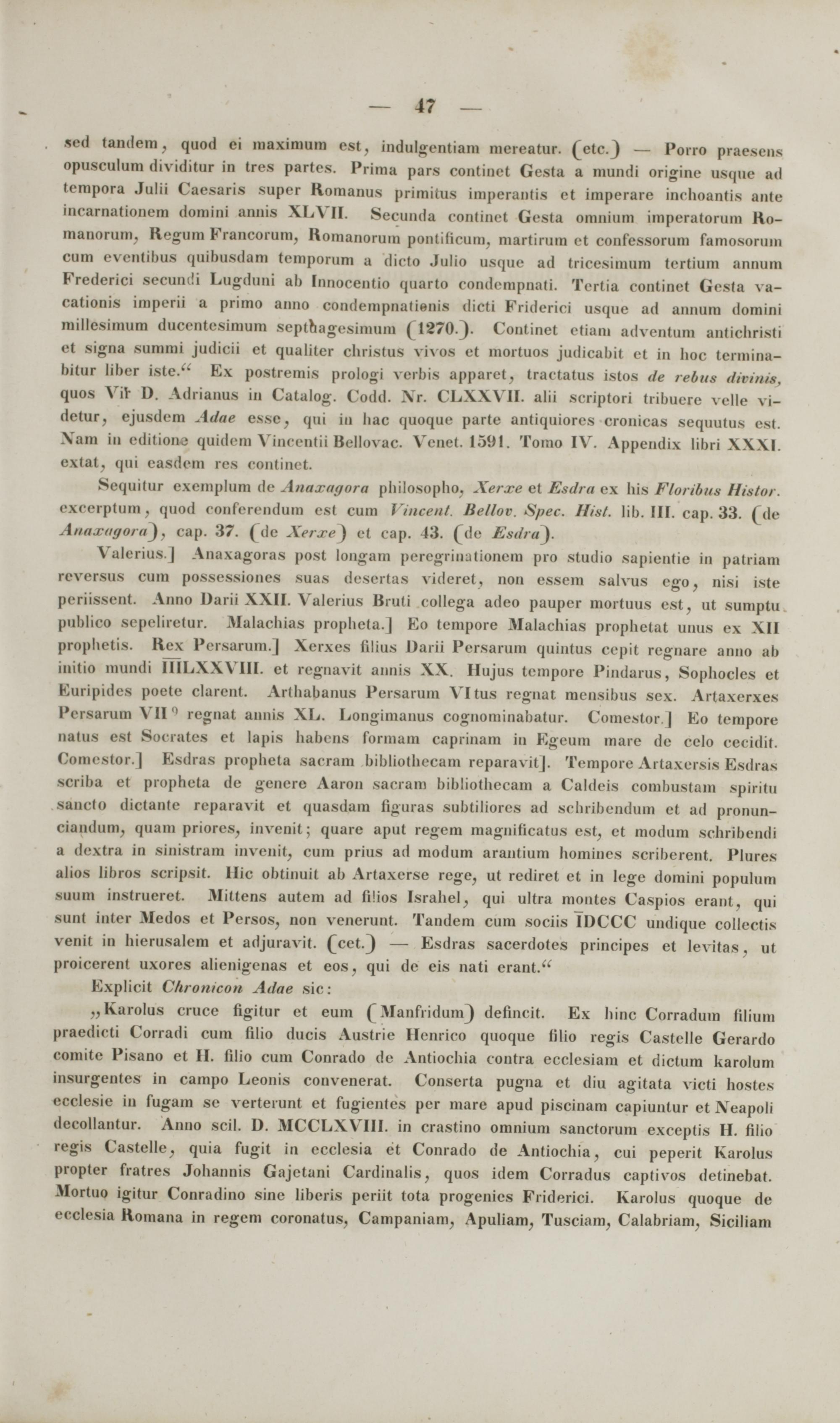 Md tandem, quod ci maximum eat, induJgentiam meroatur, (ete.) — Porro praeseiu opusculum dividitur in tres partes. Prima pars continet Gesta a mundi originc usque ad tempora Julii Cacsaris supcr Romanus primitufl imperantis et imperare inchoantis ante incarnationem domini annis XLVII. Secunda continet Gesta omnium iroperatorum Ko- manorum, Regum Francorum, Komanorum pontificum, martirum et confessorum ramosorum cum cvcntibus quibusdam tcmporum a dicto Julio usque ad tricesimum tertium annum Frederici secundi Lugduni ab [nnocentio quarto condempnati. Tertia continet Gesta va- cationis impcrii a primo anno condempnatiBiiis dicti Friderici usque ad annum domini millcsimum ducentesimum septbagesimum ( 1270.). Continet etiam adventura antichristi et signa summi judicii et qualitcr christus vivos et mortuos judicabit et in hoc termina- bitur libcr iste." Ex postremis prologi verbis apparet, tractatus istos de rebu* dhHnia } quos Vft D. Adrianus in Catalog. Codd. Nr. CLXXVII. alii scriptori tribuere velle vi- detur, ejusdem Adae ssse, qui iu bac (pioquc partc antiquiores cronicas sequutus esl \am in editione quidera Vincentii Bellovac Venet. 1591. Totno IV. Appendix libri XXXI. extat, qui easdem rcs continct.