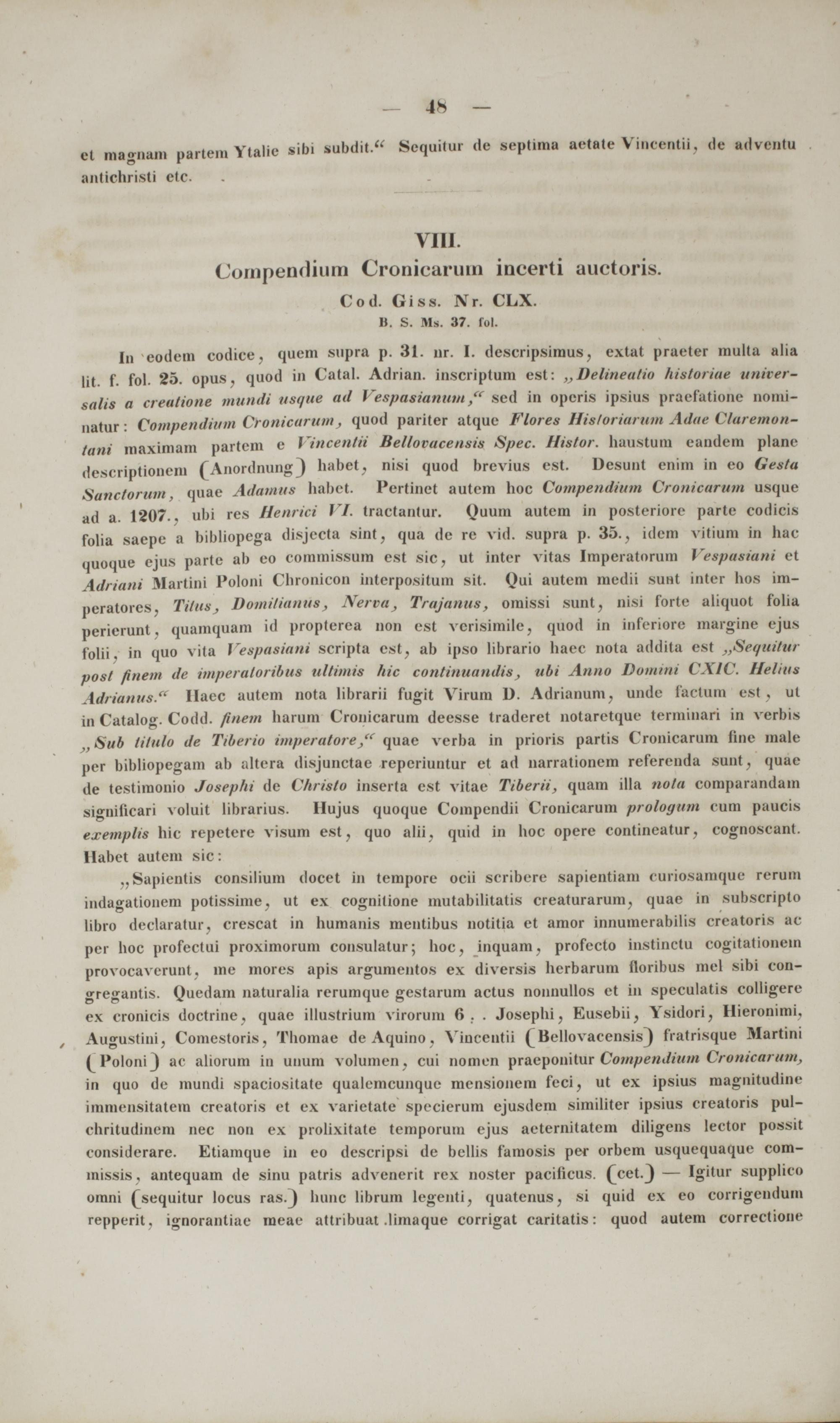 In eodem codice, quem supra p. 31. nr. I. descripsimus, extat praeter multa alia lit. f. fol. 25. opus, quod in Catal. Adrian. inscriptum est: „Delineatio hittoriae uniter- salis a creutione mundi usque ad l espatianutn scd in operis ipsina praefatione nomi- natur: Compendhtm Oonicarum } quod pariter atque Flores Hisloriarum Adae Chtremon- tani iiiaxinium partem e ' ineenth Beltovacensis Spec. Histor. haustum eandem plane descriptionem (Anordnung) habet, nisi quod brevius est. Desunt enim in eo Getta Sanetorum . quae Adamu» habet. Pertinet autem hoc Compendhtm Croniearum usque ad a. 1207.. ubi res Henrici VI. tractantur. Quum autem in posteriore parte codicis folia saepe a bibliopega disjecta sint, qua de re vid. supra p. 35., idem vitium in hac quoque ejus parte ab eo commissum est sic, ut inter vitas Imperatorum Vespasiani et Adriani Martini Poloni Chronicon interpositum sit. Oui autem medii susl inter hos im- peratores, Titus, Domilianus, Nerva, Trajanus, omissi sunt, nisi forte aliquot folia perierunt, quamquam id propterea non est verisimile, quod in inferiere margine ejus folii, in quo vita Vespasiani scripta cst, ab ipso librario haec nota addka esl „Sequitur post /inem dc imperatoribus ulthnis hic continuandis, ubi Anno Domini CXIC. Uelhts Adrianus." Ilaec autem nota librarii fugit Virum D. Adrianum, unde mctum esl . ut in Catalog. Codd. finem harum Cronicarum deesse traderet notaretque terminari in verbis ,Sub tilnlo de Tiberiu imperatore quae verba in prioris partis Cronicarum fine male per bibliopegam ab altera disjunctae repcriuntur et ad narrationem referenda sunt. (juae de testiraonio Josephi de Chrisio inserta est vitae Tiberti, quam rlla nota comparandam significari voluit librarius. Ilujus quoque Compendii Cronicarum proloffum cum paucis exemphs hic repetere visuni est, quo alii , quid in hoc opere contineatur , cognoscant. Ilabet autem sic: