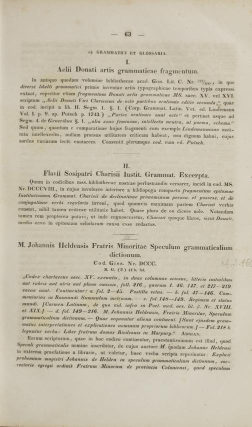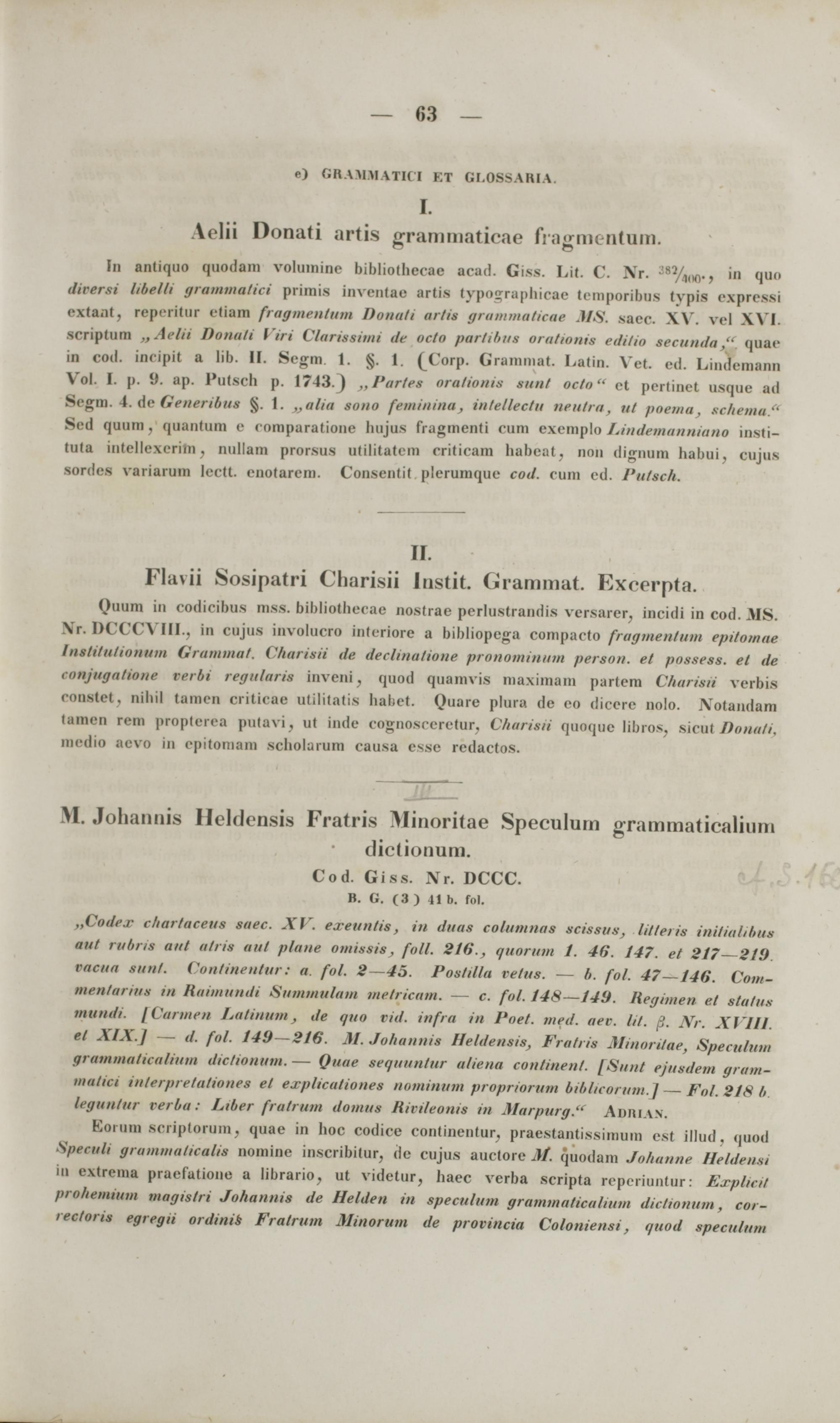 in antiquo quodam volumine bibliothecae acad. Giss. Lit. C. Nr. " 8 %io. , in quo dirersi libelli graiiunalici primis inventae artis tjpograpaicae teniporibus tvpis expressi extaat. reperitur etiam fragmentum Donatt artit grammaticae .l /.v. saec. W. vel Wl. scriptum „Aelii Donalt Viri Clmrittimi de oeta partibu* orationit editio teeundmJt quae in cod. ineipit a lib. II. Segm. 1. §. i. (X'orp. Grammat. Latin. Vet ed. Lindemann Vol. I. p. 9. ap. Putscfa p. 1743.) „Partet orationia tunt oeto" et pertinel naque ad Segm. 1. de Generibut I. , .nlni tono feminina, intellectu neutra, nt poema, tehema/' Scd quum, quantum e comparatione hujus fragmenti cum exemplo Liindemanniano insti- tuta intellexeriin, nullam prorsus utilitatcni criticam habeat, non dignum habui , cujus rordea variarum lectt. enotarem. Consentil plerumque cod. cum ed. Putaeh.