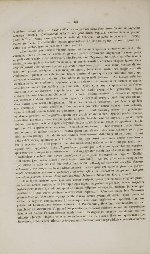 „ Ine vitabilis necessitatis videtur casus, ut errent frequenter et tamcn nesciant, ubi corruant, qui de dictionibus ebreis et grecis tractare presumunt, linguarum ipsarum prius aliquali saltem noticia non accepta. Unde Papias, tum Huguieio, Ebrardus, qui Greeiemum edidit, et alii quidam tractatores in suis, ut aperte constat, operibus proptcr ignorantiam originis eorum, de quibus agebant, graviler erraverunt, ita ut non solum sustinendi non sint, sed pocius corrigendi, non meo, ut spero, temeritatis ausu, sed magis veritatis confidentia, quam a meis doctoribus labore diutino diligentique cura mutuatus suin , qui sciverunt veraciter et potcrant infallibiliter dc hujusmodi judicare. Ad factani mihi in- stantiam subii hunc labOrem, apponens de mco calamum, atramcntum et cartam et manus articulos scribentes hoc quidem exaratum est. Quod <}uia tangit aliquos et ob id forsan emulationis aliquit incurret, rogo fratres, qui non statim conspuendum putaverint, juxta verbum doctoris beatissimi Geronimi, ut privata lectione contenti fastidiosis et ingratis ikiii ingerant verbum; nauseent, quod appetitus eorum abhorreat, quod languens stoma- chus eorum mox rciciat indigestum. Si tamen caritatis instinctus, qui bonum quidem non commutat, reputat amissum, hec cuiquam profectus causa censeat non celanda, operarii subdoli nomen taceat et personam, quia, ut ait quidam, minus est praeciosus el absquc ponderc sermo gravis, quem non gravis edidit auctor. Quodsi prodar alienae sentcntiae rcpetitor, sum absque cypho alicujus Joseph nescicns augurari; sicubi vero videbor duri forsan oris et asperi, legentis magis excitationem, quam arrogantiam intendo propriam vel depressionem alienam. Sciendum praeterea, iu hoc tractatu pauca princi- paliter poni, m quibus pectaverit contra quem intendimus, sive non habcudo quod pro- misit in suo prologo, satisfactionein scilicet vocabulorum difficiliura biblie, cum restent adhuc difliciliora, quamque posuit, sive in hiis, que posuit, non satis acrem examinando vel in accentu, vel orthographia, vel dictionum compositione vel alio quoque modo, nec oportct mihi opponerc, quod Iluguicionein plerumque vel alium quemlibet sit sccutus, quia errorem concipiens el errorem ultro vel negligenter suscipiens et eum ad alios temere transfundens ejusdem sunt novae participes et pene paris redargucionis digni." Explicit prohemium (^sequuntur cetera, quae supra posuimus). Ad hoc prooemium complendum ipse auctor in extrcmis libri sui verbis haec addit: „Quidquid autem hic vel alibi dixerim vel dicant, me sempcr subicio judicio saniori, cui si quid vel scienter forle rel quoquo modo probabili/er me dicere pu/avero, libenter offero et reverenter suppono. Ilu fimt epeeulum grammaticalium dictionum magietri Johannis Heldeneie Deo gratias."