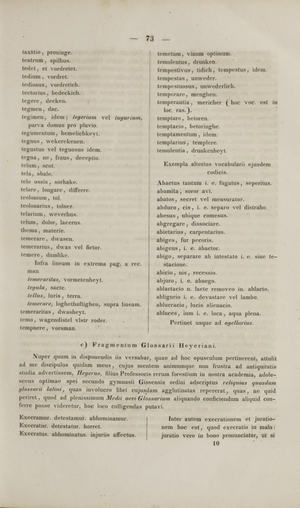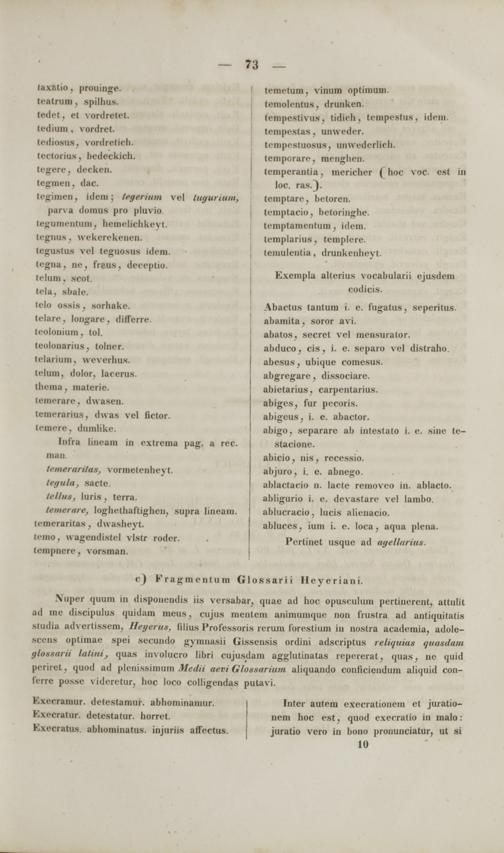 Nuper quum in disponendis iis versabar, quae ad hoc opusculum pertinerent, attulit ad me discipulus quidam meus, cujus mentem animumque non frustra ad antiquitatis Studia advertissem, Heyerus, lilius Professoi is rerum forestium in nostra academia, adole- scens optimae spei secundo gymnaaii Gissensis ordini adscriptus reliquias quasdam glotearU latini } quas involucro libri cujusdam agglutinatas repererat, quas, ne quid periret, quod ad plenissimum Medii aevi Glossarium aliquando conficiendum aliquid con- ferre posse videretur, hoc loco colligendas putavi.