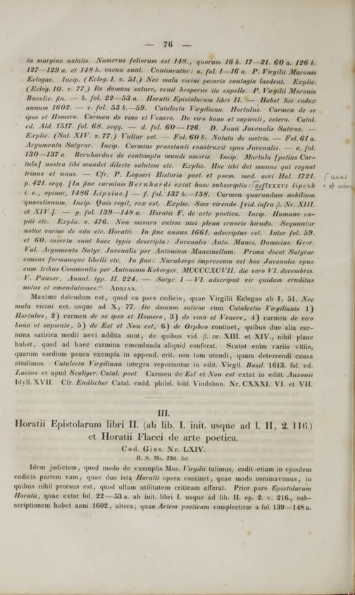 in margine notatie. Numerue fohorum eei 148., quorum 16 b. t7 -21. 60 n. 126 b. t27 —129 a. et 148 b. vacuti ntnt. ContinentUr: a. fol. t—16 a. P. Virgilii Maronis Eclogae. Incip. (Eclog.l. v. 51.) Nec. mala vicini pecori» conlagia laedent. Explic. (Eclog.10. v. 77.) tte dominn eature, venil heepeme ite capelle. P.Virgihi Marenie Bucolic. fin. — b. fol. 22—53 a. Horatii Epistolarum libri II- — Habel liic codex annum 1602. — c. fol. 53 l>. — 59. Catateeta Virgiliana. Hortulue. Varmen de ee ipeo et Homero. Carmen de vino et Venere. J)e viro bono et eapienti, cetera. Vatal. ed. Ald. 1517. fol. 68. seqq. — d. fol. 60 —126. D. Junit Juvenalie Satirae. — Explic. (Sal. XII '. v. 77.) Vultur cet. — Fol. 60 b. Notala de metrie. — Fol. 61 a. Argumenta Satyrnr. Incip. Carmine praeetanti conetruxil opue Juvenalie. — e. fol. 130 —137 a. Bernhardue de eontemptu mundi amorie. Incip. Martula [potiueCar- tulaj nostra tiln mandet dilecle salulem elc. Explic. Hoc tibi det munue qui regnat trinus el unus. — Cfr. P. Leyseri Historia poel. et poem. med. aevi Hal. 1721. ■ 0>t* p. 421. seqq. [In fine carmiiiis Bemhardi extat haec subscriptio: zcflxxxvi lipczk - i\r ovltd i. e., opinor, 1486 Lipeiae.] —■ f. fol. 137 b. — 138. Carmen quarundam nobilntm yuaeetionum. Ineip. Quie regitj rex est. Explic. Sive vireudo [vid. infra /?. Nr. XIII. et XlV.f. — g. fol. 139—148 a. Horalii F. de arle poetica. lncip. Humano ca- fii /i ete. Explic. v. 476. Non mieura eutem niei phtna cruorie hirudo. Sequuntur notae variae de vita etc. Horatii. ln /iue annue 1661. adeeriptue est. lnter fol. 59. el 60. ineerta eunt haec tppie deecripla: Juvenalie Anto. Manci. Oomicius. Genr. Val. Argumenla Satgr. Juvenalie per Anlonium Manekullum. Prima docei Satyrae caueae formamque libelli etc. In fine: Nurnberge impressum est hoc Juvenalis opue cum tribue Commentie per Antonium Koberger. MCCCCXCVII. die vero VI. decembrie. V. Panzer, Annal. typ. II. 224. — Satyr. I—VI. adscripsit vir quidam eruditue nolas et emendaliones." ADM \ v